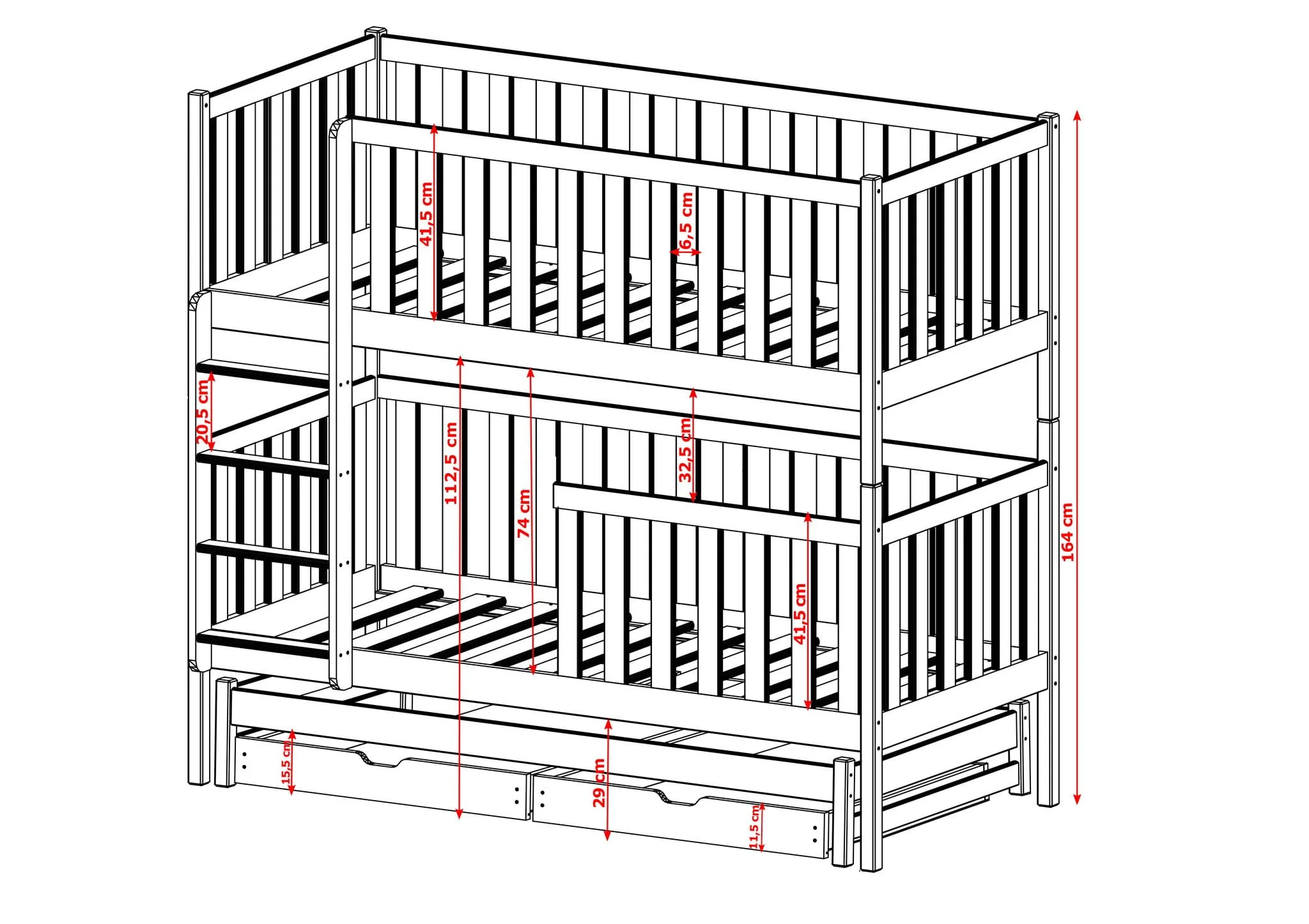 - Abstand vom Boden bis zur oberen Matratze: 112,5 cm