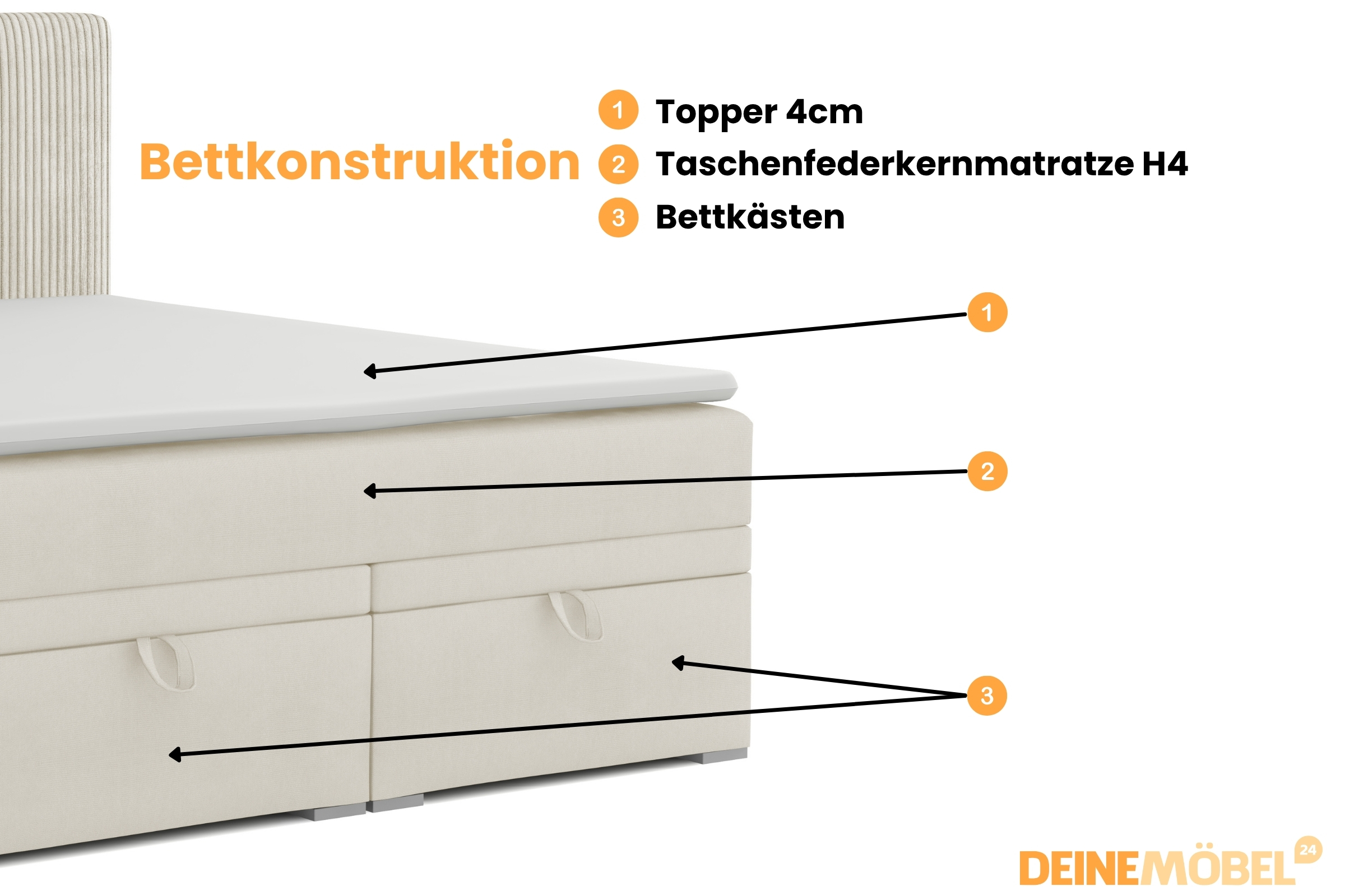 DAGA 140x200 Poso 100 / Paros 1 Creme Boxspringbett mit Bettkasten und einer durchgehenden Matratze H4 Deine Möbel