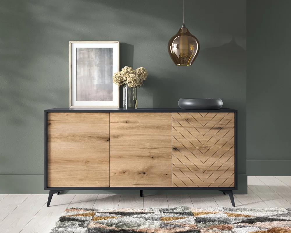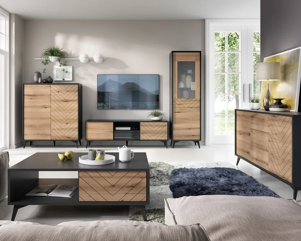 Entdecken Sie die Diamant Kollektion - perfekt für Liebhaber von Minimalismus, modernem Stil und funktionalen Möbeln. Die Kombination aus Eichenholz Evoke und Schwarz verleiht jedem Stück einen einzigartigen Charakter. Dank ihrer vielseitigen Form passen sich die Diamant-Möbel mühelos jedem Wohnzimmer an, sei es modern, loftartig oder klassisch. Besonders hervorzuheben sind die geriffelte Fronten, die Originalität und Eleganz verleihen. Durch ihre Montage auf Metallfüßen sind die Einheiten leicht zu pflegen und visuell leichter. Tauchen Sie ein in die Welt der Diamond Kollektion und erleben Sie zeitlose Eleganz und Funktionalität.