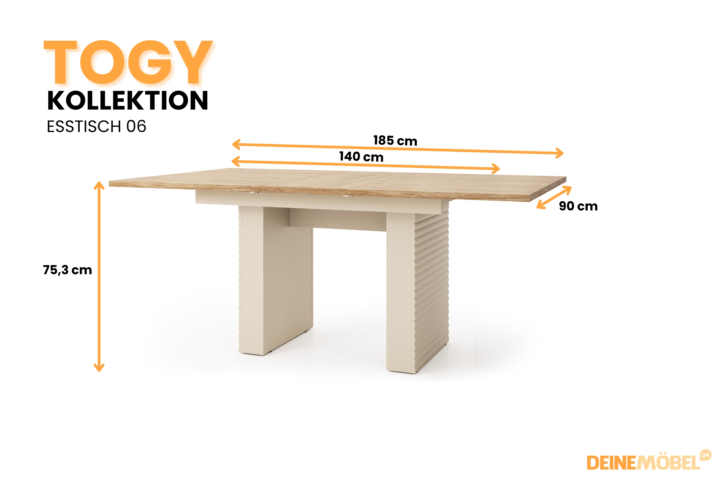 Der ausziehbare Esstisch Togy 06 bietet ausreichend Platz für den täglichen Gebrauch und lässt sich bei Bedarf für Gäste erweitern. Die warme Holzoptik in Kombination mit der klaren Form schafft eine einladende Atmosphäre für gesellige Abende.