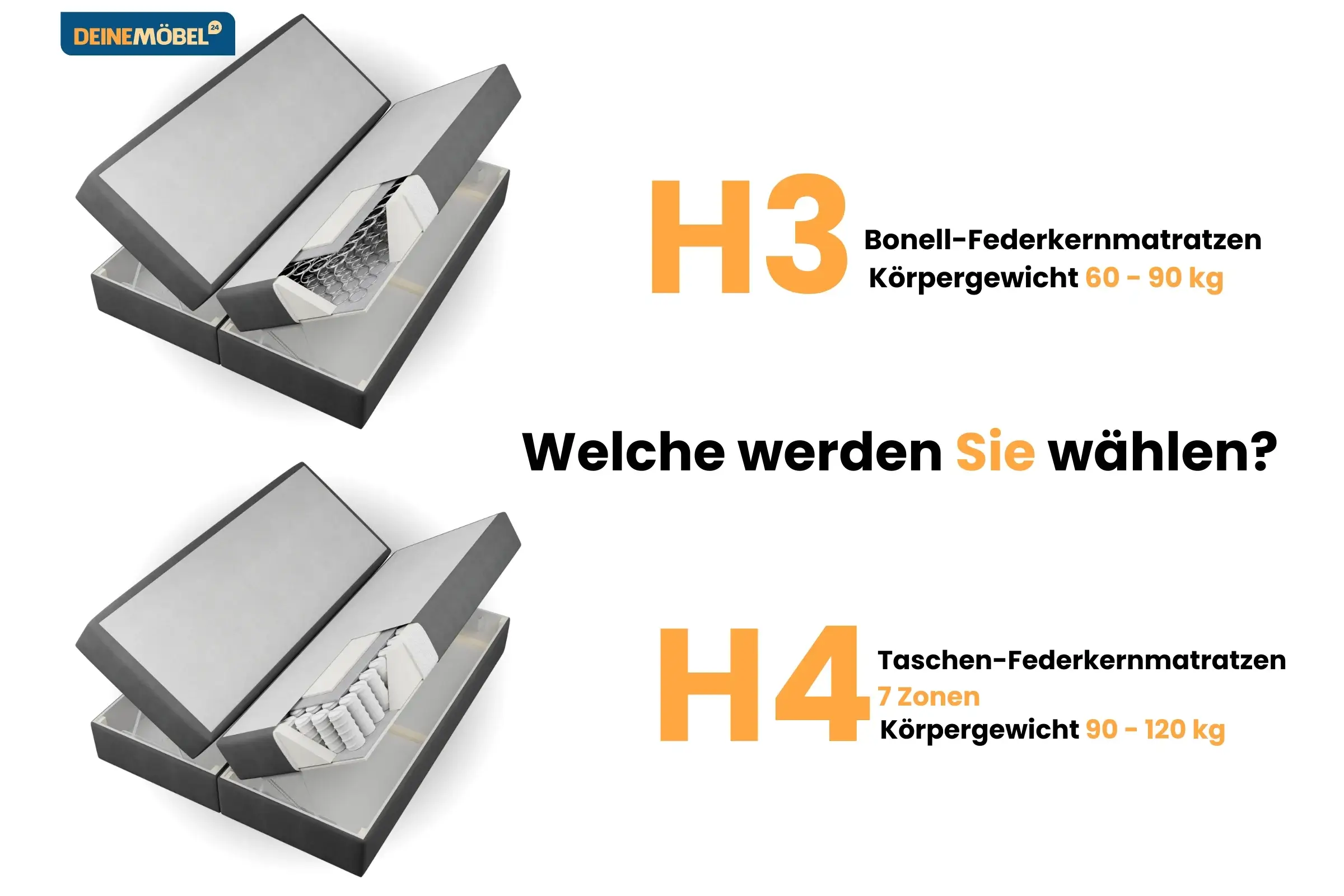 - Matratze wählbar: H3 oder H4: Entscheiden Sie sich zwischen der Bonell-Federkernmatratze H3 (60–90 kg) oder der optionalen Taschenfederkernmatratze H4 (90–120 kg). Beide Matratzen passen sich Ihrer Körperform an und bieten durch gezielte Druckentlastung maximalen Komfort, ideal für Rücken- und Bauchschläfer.