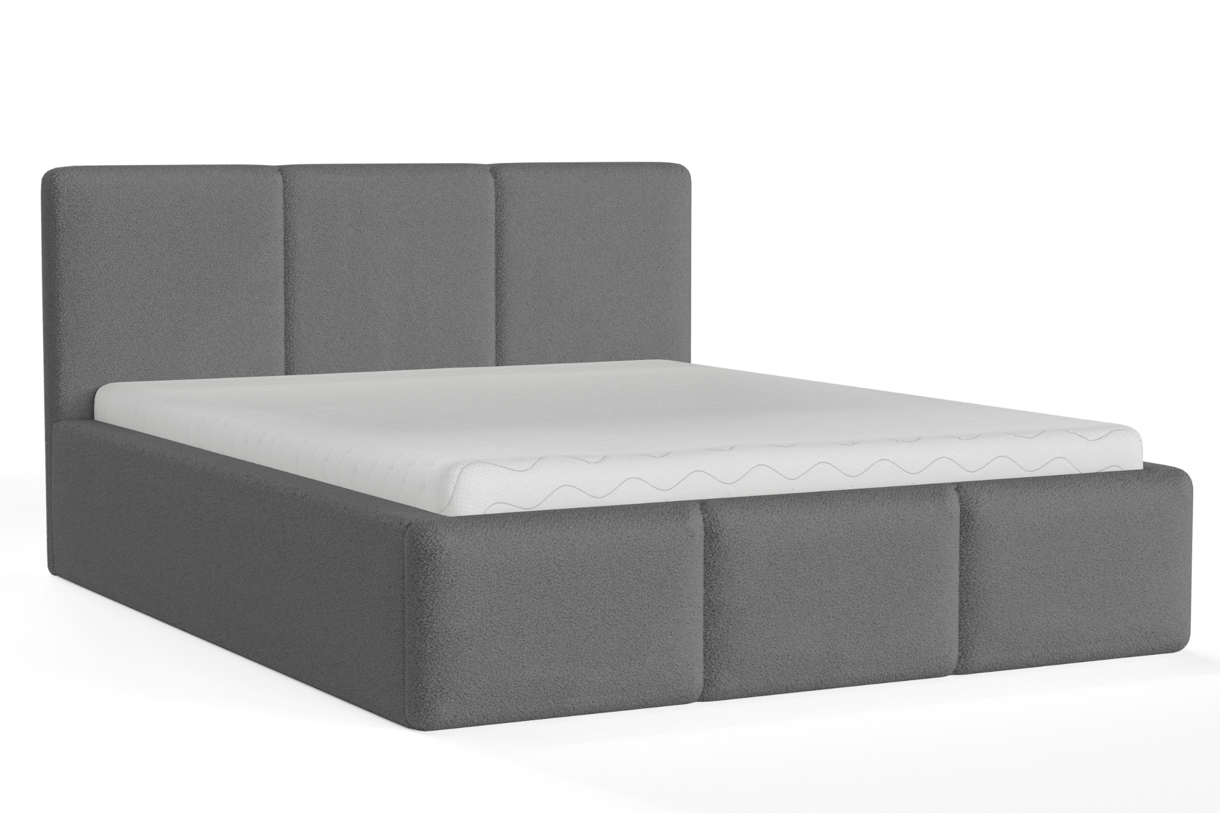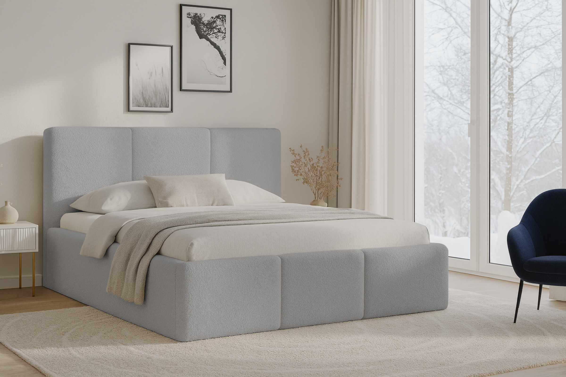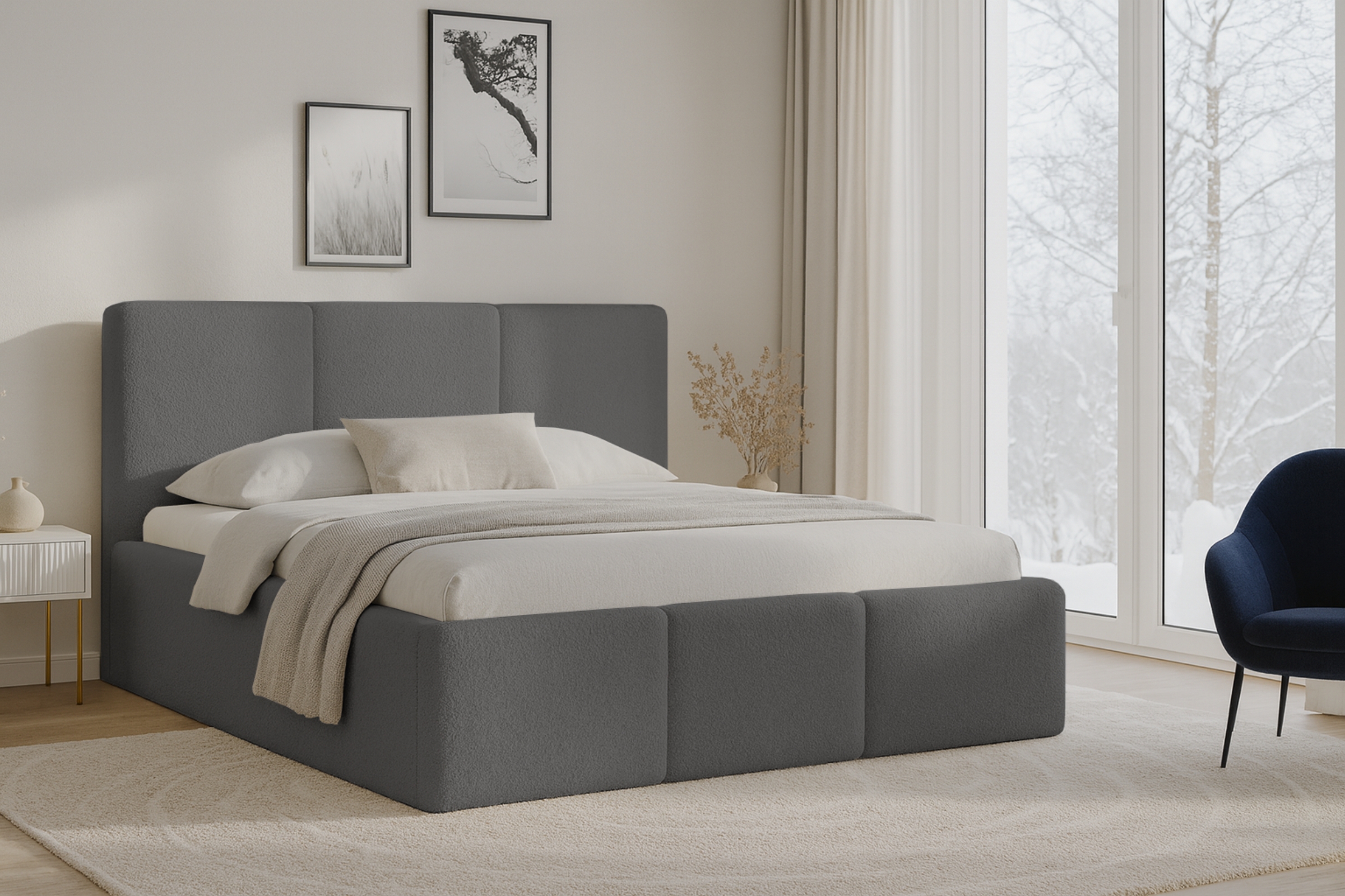 Das hohe, weich gepolsterte Kopfteil bietet angenehmen Halt beim Lesen oder Entspannen und verleiht dem Bett eine einladende, elegante Optik. Je nach Auswahl ist das Bett in modernen, pflegeleichten Stoffen wie strukturiertem Stoff erhältlich. Die Stoffe sind angenehm im Griff und setzen stilvolle Akzente im Raum.