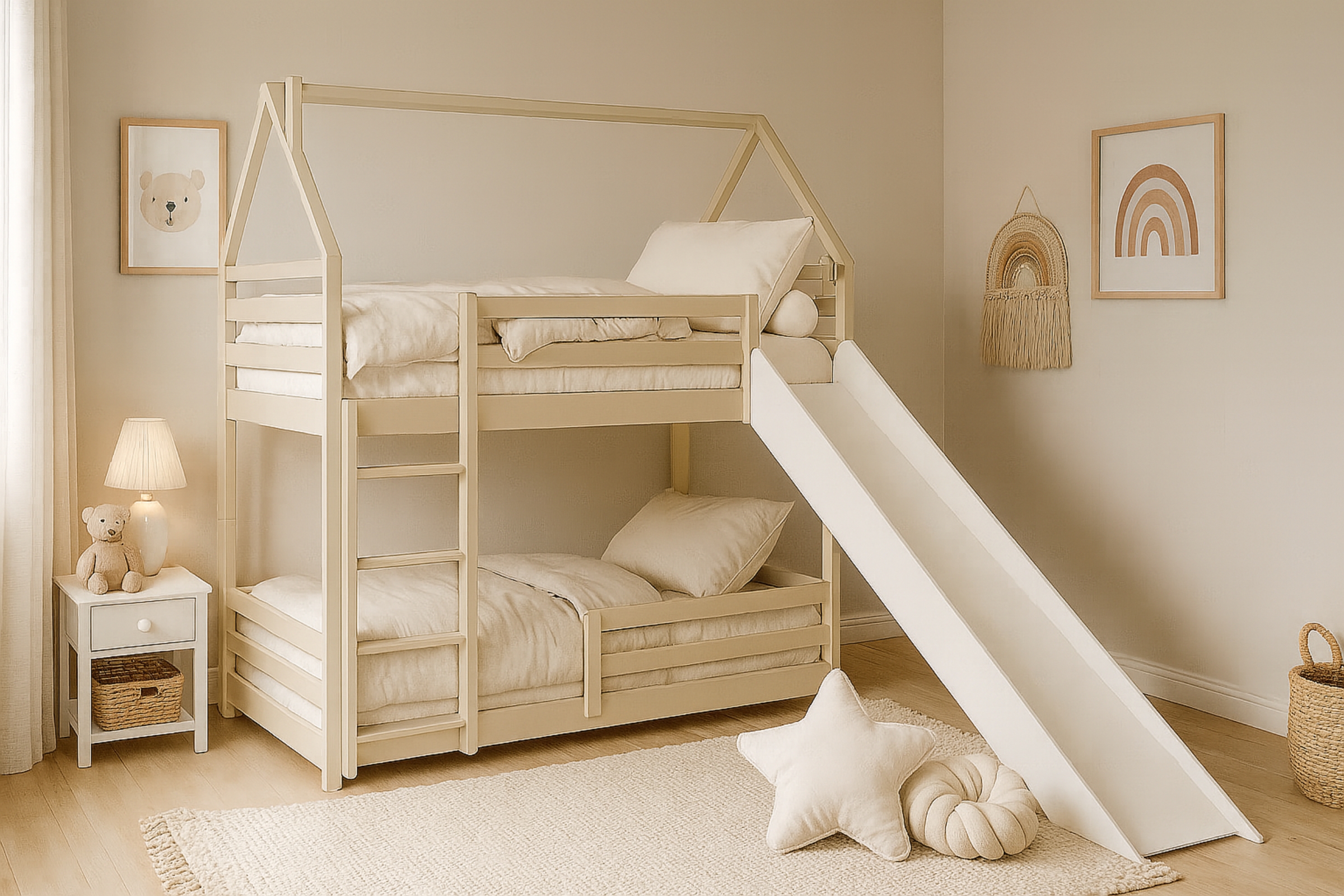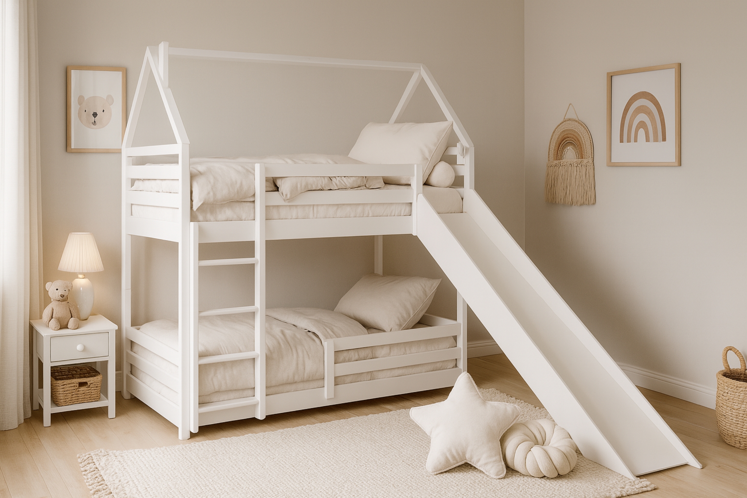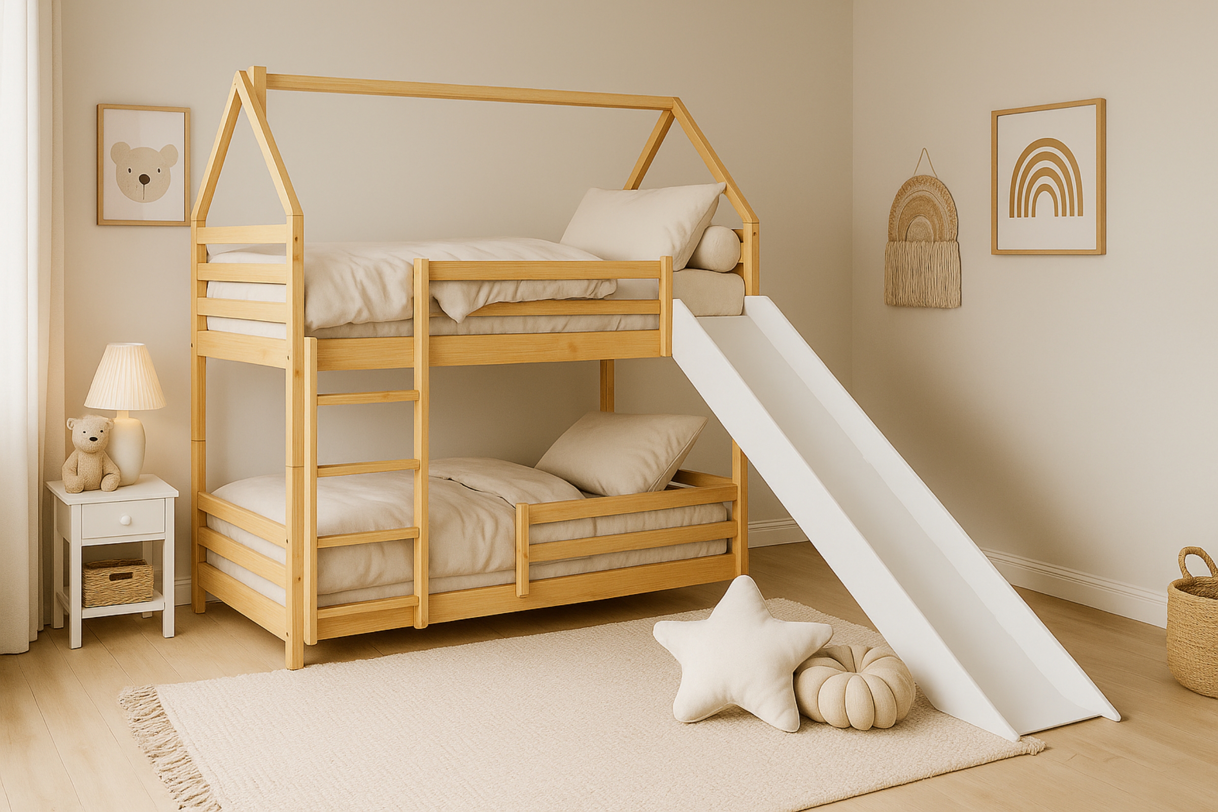 Das FUN Etagenbett ist die perfekte Wahl für Familien, die ein sicheres, langlebiges und gleichzeitig spaßiges Möbelstück für ihre Kinder suchen. Mit der integrierten Rutsche und der Möglichkeit, das Bett in zwei Einzelbetten zu teilen, ist es flexibel nutzbar und bietet langjährigen Komfort und Freude.