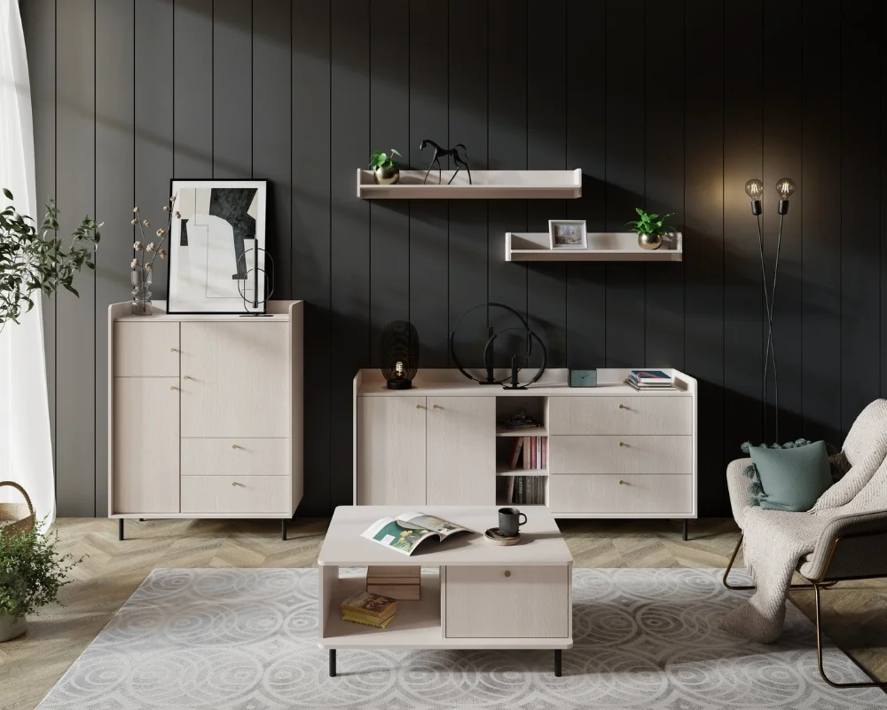 Die Kombination aus hellem Holz und schwarzen Details sorgt für Kontrast und passt sowohl zu warmen als auch zu kühleren Interieurs.