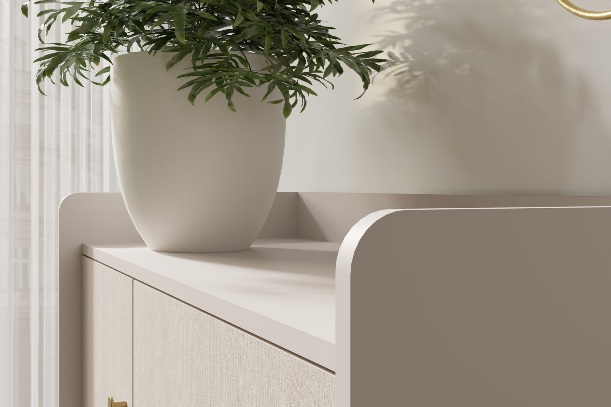 - Farblich abgestimmte Oberfläche in Sandbeige mit strukturierter Holzoptik