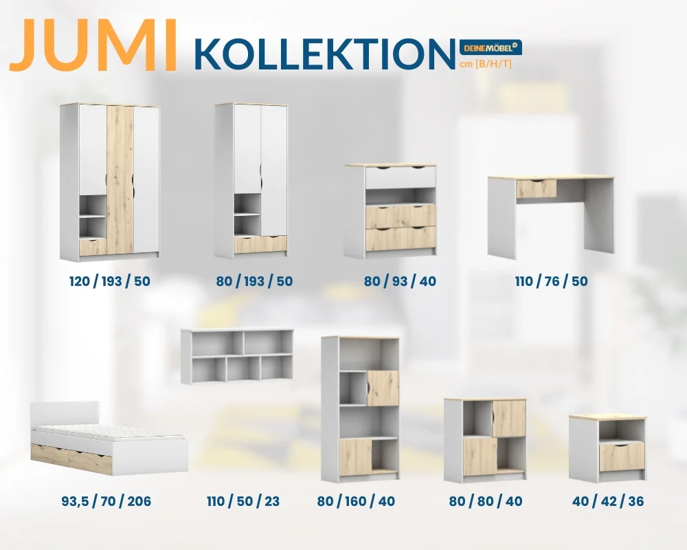 Das JUMI-System ist ein umfassendes Möbelset, das Schränke, Kommoden, einen Schreibtisch und vieles mehr umfasst. Dieses moderne und funktionale Set wurde mit Blick auf den dynamischen Lebensstil der jungen Generation entwickelt und bietet gleichzeitig ein ästhetisches Design und praktische Lösungen.