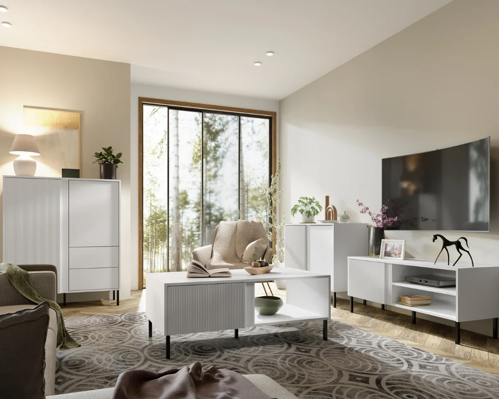 Möbel MEDIOLAN sind reizvolle Kombination aus geometrischen Formen und dezenten Farben. Geriffelte Fronten verleihen Finesse und Eleganz. Metallfüße unterstreichen das einzigartige Design der Möbel.