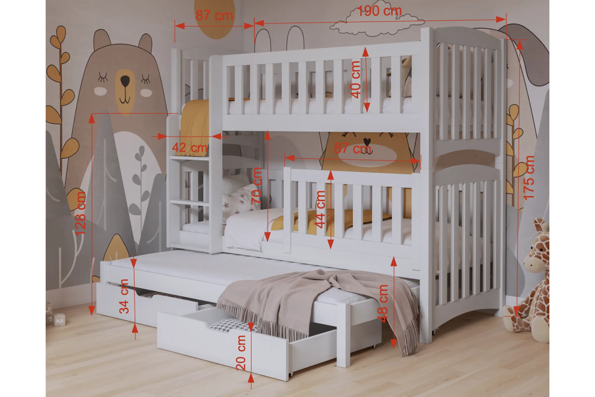 Das Stockbett NOAH ist mit zwei extrem hohen Gittern ausgestattet. Der hohe Rausfallschutz sorgt für sicheren und ruhigen Schlaf Ihres Kindes. Der untere Rausfallschutz kann jederzeit mühelos abgenommen werden.