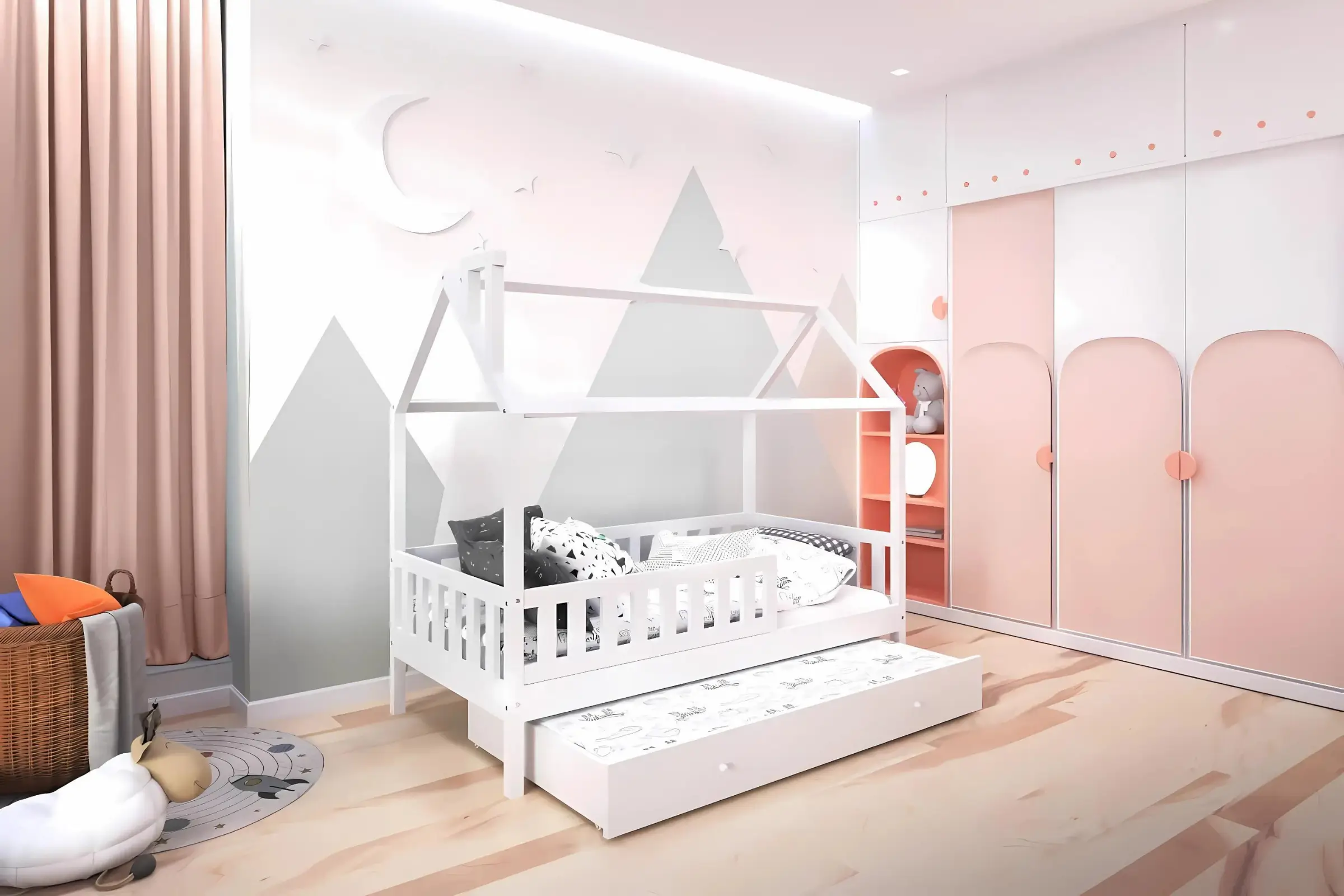 Unser Hausbett ROSI erfüllt die Träume fast jedes Kindes, wie auch der Erwachsenen. Das Hausbett bietet zahlreiche Gestaltungsmöglichkeiten und macht jedes Kinderzimmer zu einem echten Hingucker!. Das ROSI Kinderbett ist mit der zusätzlichen ausziehbaren Schlaffläche ausgestattet und ist eine ideale Lösung für Menschen, die Wert auf Funktionalität und modernes Design legen.