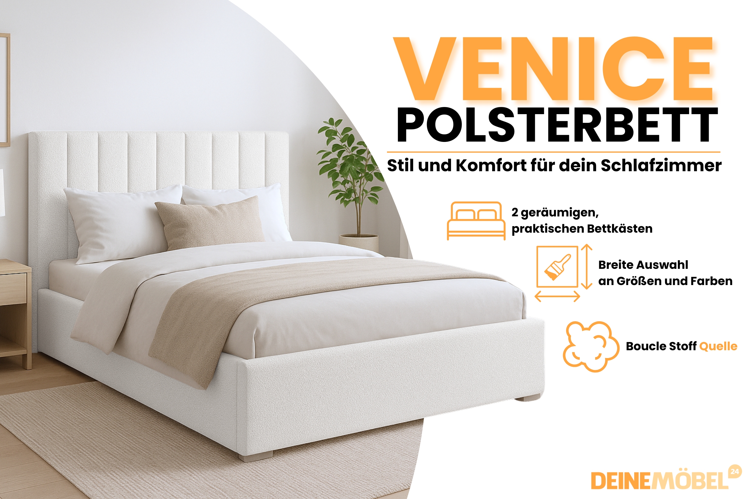 Verleihen Sie Ihrem Schlafzimmer mit dem VENICE Polsterbett einen modernen und eleganten Look – jetzt entdecken und entspannt schlafen!