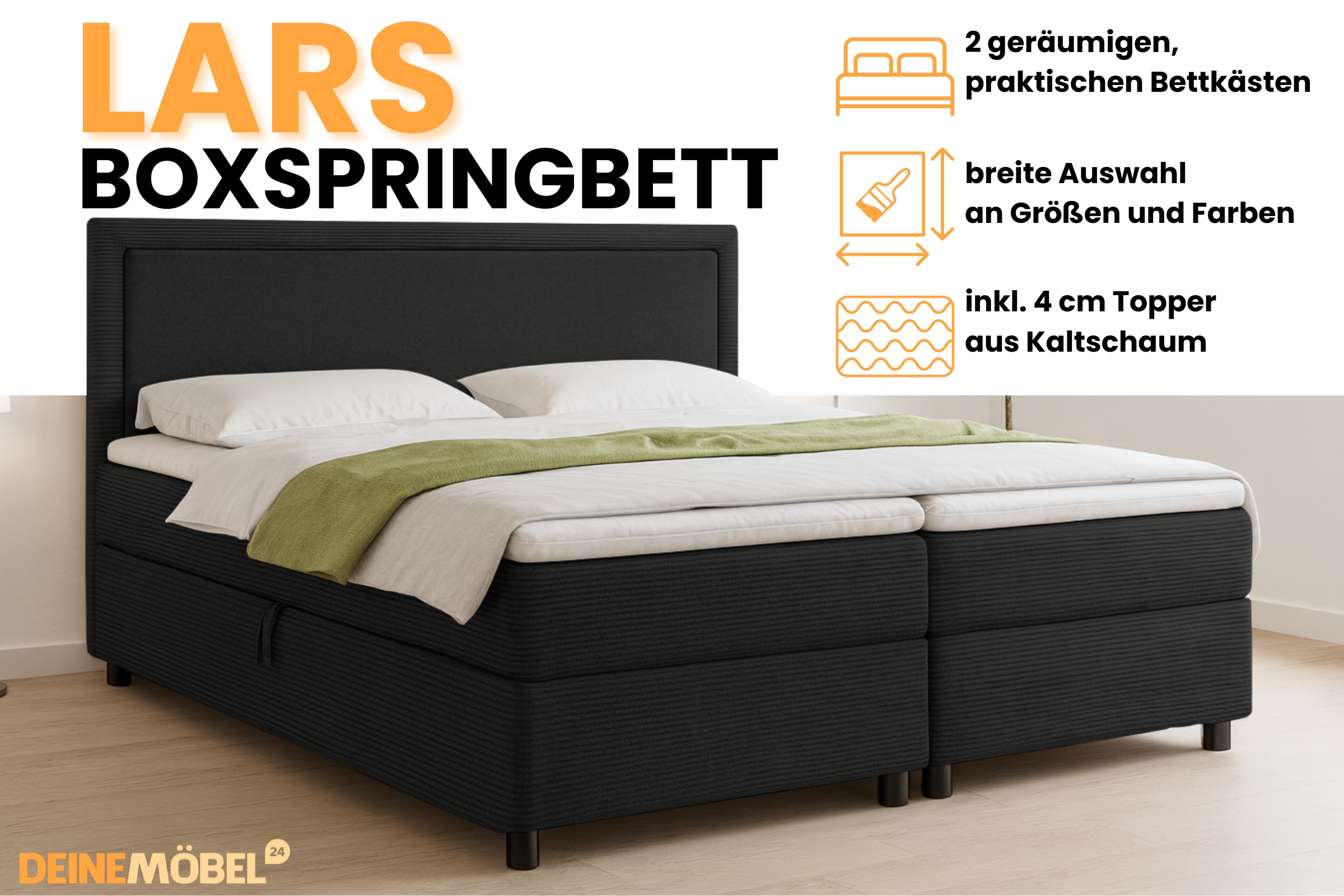 Erleben Sie den unvergleichlichen Komfort und die stilvolle Eleganz des Boxspringbett LARS. Dieses hochwertige Boxspringbett fügt sich perfekt in jedes Schlafzimmer ein und bietet eine ideale Kombination aus Komfort und Stauraum. Die integrierten Bonell-Federkernmatratzen sorgen für einen erholsamen Schlaf, während die zwei geräumigen Bettkästen ausreichend Platz für Ihre Bettwäsche und andere Utensilien bieten.