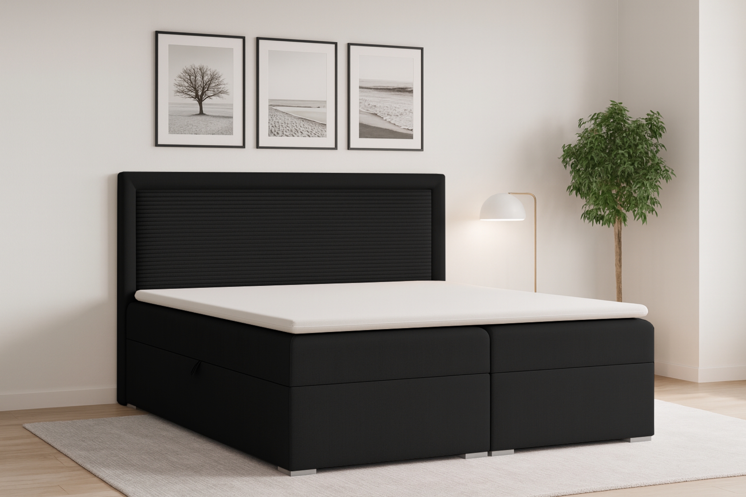 Das Boxspringbett JOHN II verbindet modernes Design mit höchstem Komfort und bietet die ideale Lösung für erholsamen Schlaf. Ausgestattet mit zwei Bonell-Federkernmatratzen, garantiert es optimale Unterstützung und himmlischen Schlafkomfort. Die praktischen, integrierten Bettkästen schaffen zusätzlichen Stauraum für Bettwäsche und Utensilien und sorgen für Ordnung im Schlafzimmer.