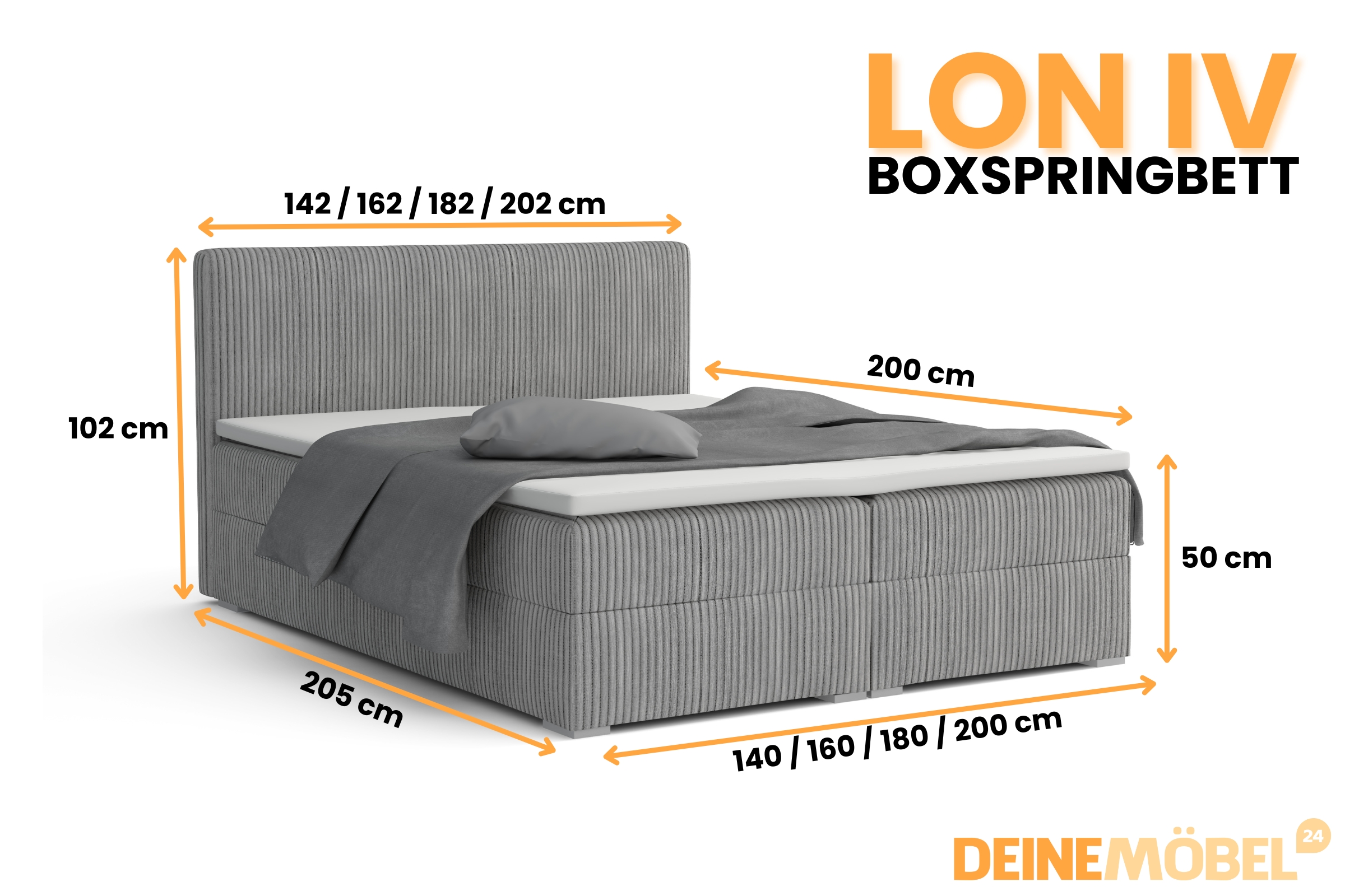 Das Boxspringbett LON IV vereint elegantes Design, hohen Schlafkomfort und praktischen Stauraum. Mit komfortabler Liegehöhe, zwei Matratzen (H3 oder H4) und integriertem Bettkasten ist dieses Polsterbett die ideale Wahl für moderne Schlafzimmer.