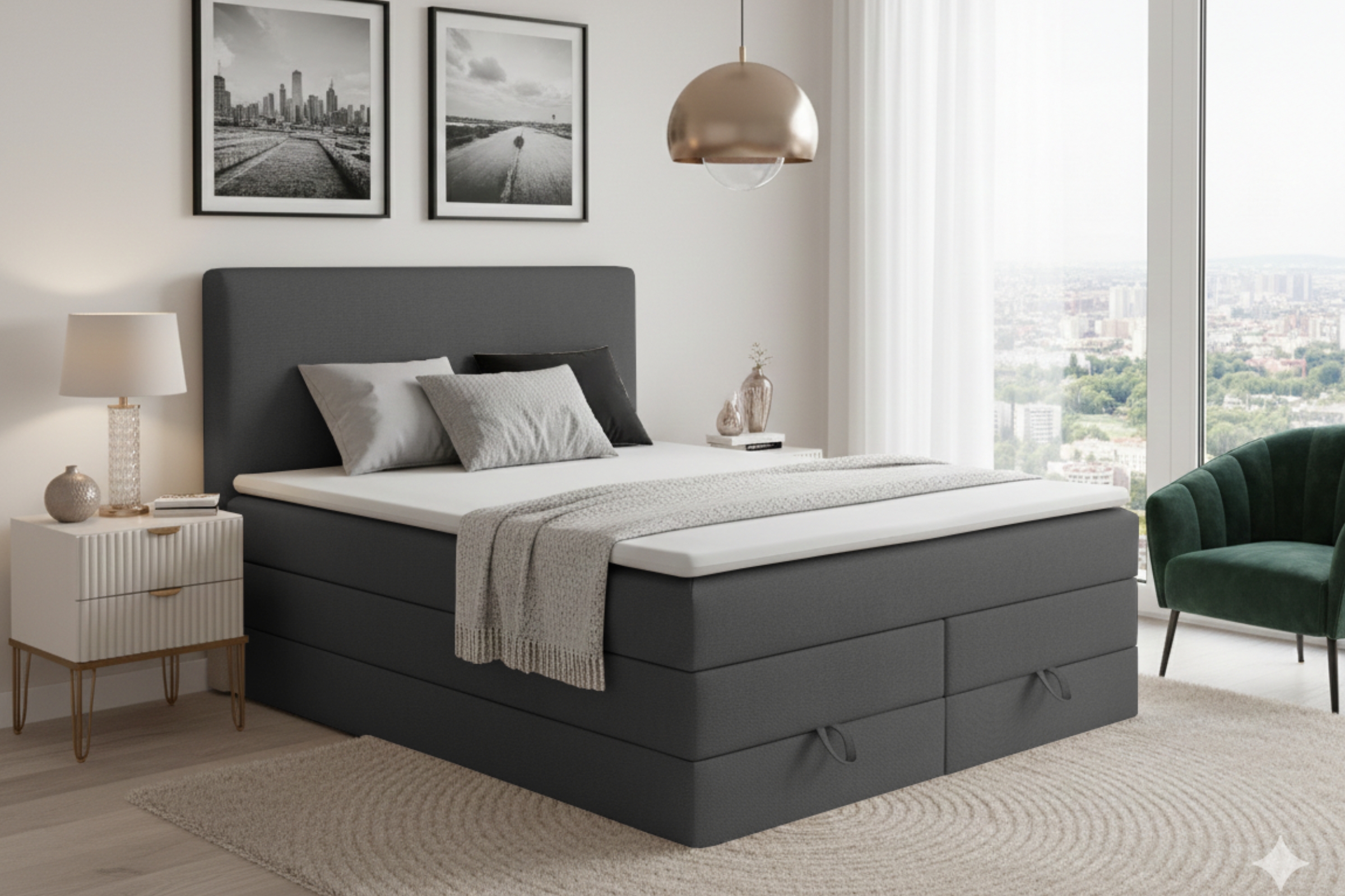 Das Boxspringbett BASIC DUO ist ein herausragendes Modell mit einem markanten Design, das die klassische Eleganz mit den neuesten Trends vereint. Dieses stilvolle Bett verleiht Ihrem Schlafzimmer eine Mischung aus Eleganz und Modernität. Die Polsterung aus strapazierfähigem Velour Kronos / Paros bietet ein äußerst angenehmes Liegegefühl und lässt sich nahtlos in verschiedene Einrichtungsstile integrieren. Dank seiner soliden Konstruktion wird dieses Bett Ihnen lange Freude bereiten. Das hohe Kopfteil und das gepolsterte Gestell verleihen ihm einen besonderen Charme und machen es zu einem Blickfang in jedem modernen Schlafzimmer. Die seitlich klappbaren Bettkästen bieten zusätzlichen Stauraum und sorgen für Ordnung im Raum, während sie gleichzeitig die überquellenden Schränke entlasten. Mit zwei Bonell-Federkernmatratzen (H3) unten und einer Taschenfederkernmatratze (H4) oben bietet dasBoxspringbett BASIC DUO ultimativen Komfort für einen erholsamen Schlaf.