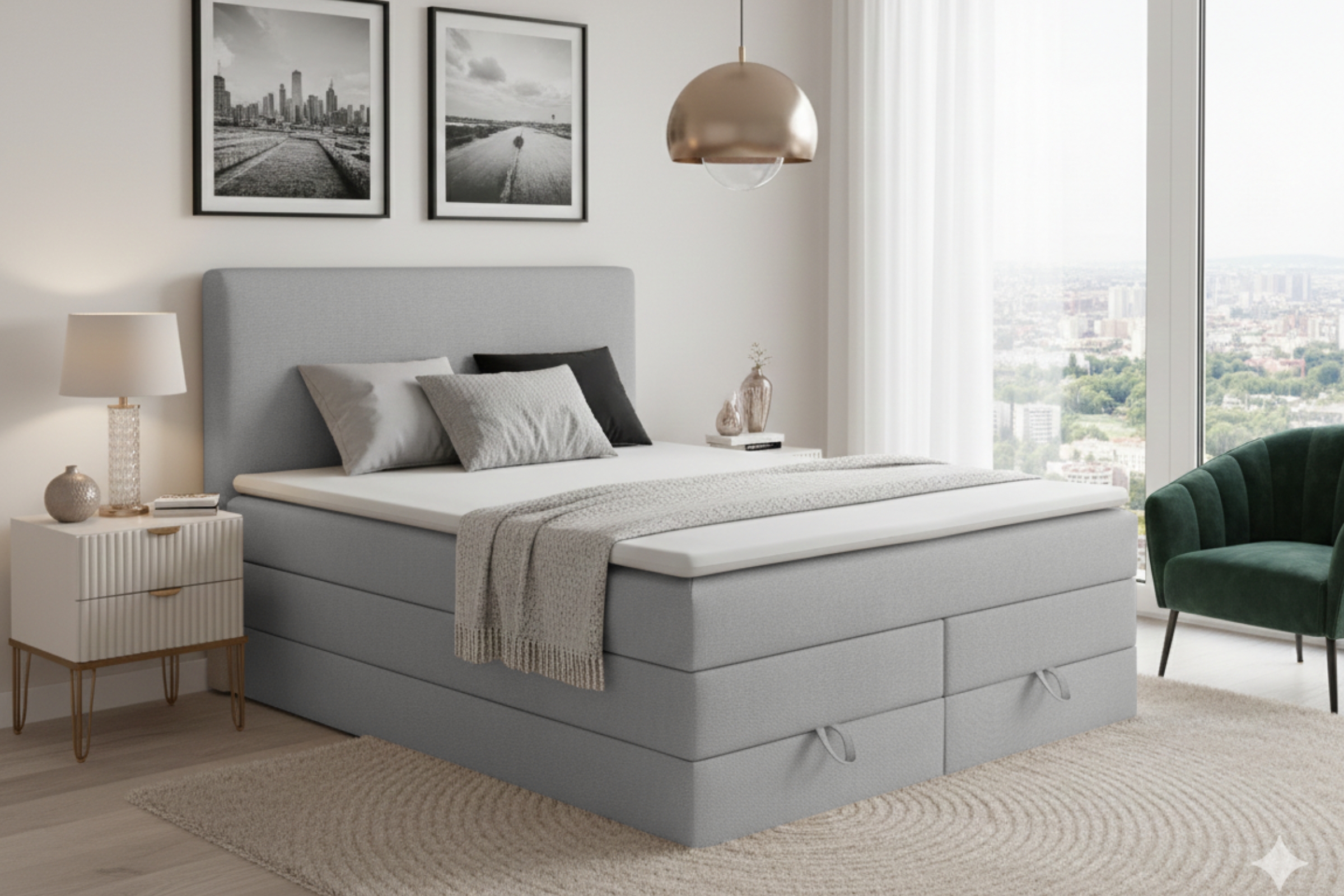 Das Boxspringbett BASIC DUO ist ein herausragendes Modell mit einem markanten Design, das die klassische Eleganz mit den neuesten Trends vereint. Dieses stilvolle Bett verleiht Ihrem Schlafzimmer eine Mischung aus Eleganz und Modernität. Die Polsterung aus strapazierfähigem Velour Kronos / Paros bietet ein äußerst angenehmes Liegegefühl und lässt sich nahtlos in verschiedene Einrichtungsstile integrieren. Dank seiner soliden Konstruktion wird dieses Bett Ihnen lange Freude bereiten. Das hohe Kopfteil und das gepolsterte Gestell verleihen ihm einen besonderen Charme und machen es zu einem Blickfang in jedem modernen Schlafzimmer. Die seitlich klappbaren Bettkästen bieten zusätzlichen Stauraum und sorgen für Ordnung im Raum, während sie gleichzeitig die überquellenden Schränke entlasten. Mit zwei Bonell-Federkernmatratzen (H3) unten und einer Taschenfederkernmatratze (H4) oben bietet dasBoxspringbett BASIC DUO ultimativen Komfort für einen erholsamen Schlaf.
