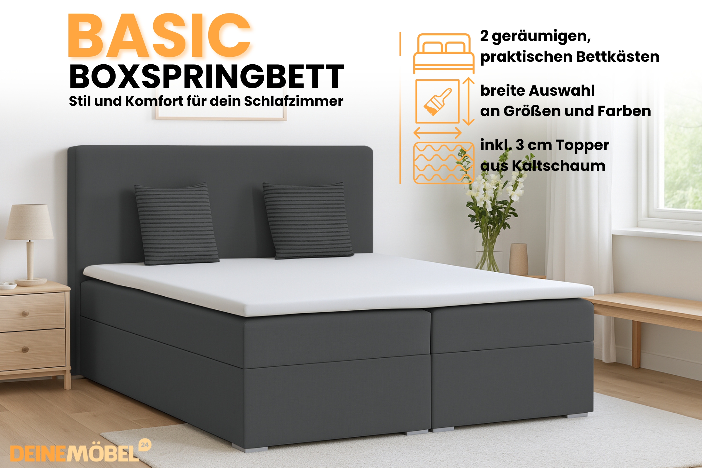 Das Boxspringbett BASIC bietet bequemen Schlaf, eine stabile Konstruktion & cleveren Stauraum. Dank der hochwertigen Matratze (19 cm) und dem Topper (4 cm) genießen Sie jede Nacht höchsten Komfort. Das schlichte, moderne Design macht das Bett zeitlos und perfekt für jedes Schlafzimmer.