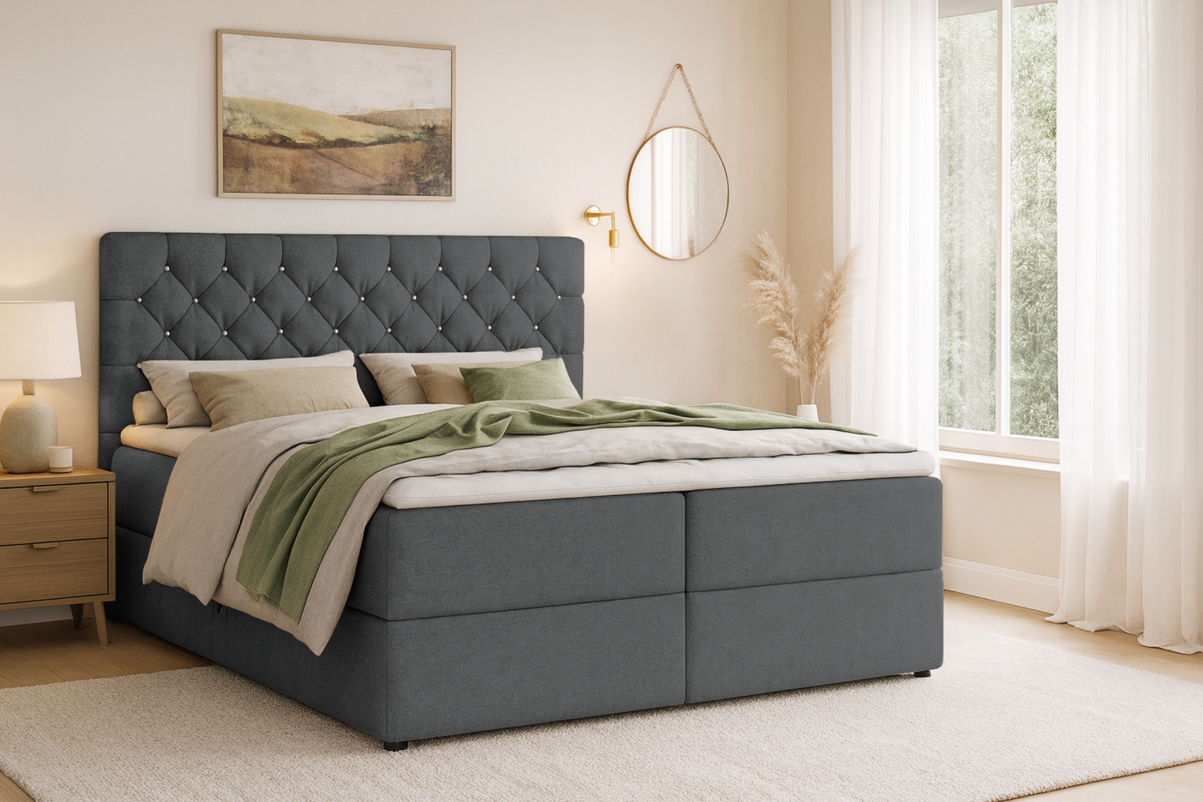 Das Boxspringbett BEST bietet luxuriösen Komfort und eine elegante Optik. Wählen Sie Ihre Wunschfarbe aus Beige, Hellgrau, Schwarz oder Dunkelgrau und genießen Sie erholsame Nächte in einem stilvollen Schlafzimmer. Dieses Bett überzeugt durch seine hohe Qualität, praktische Funktionen und sein außergewöhnliches Design.