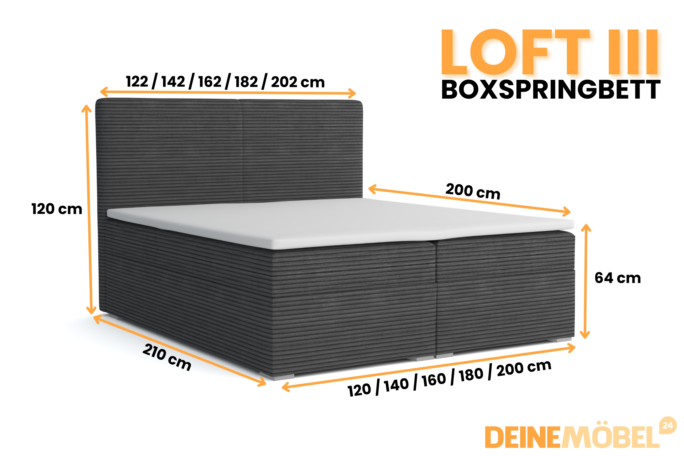Modernes Design trifft auf durchdachte Funktion: Das Boxspringbett LOFT III überzeugt mit stilvollem Cord-Bezug, hohem Kopfteil und komfortabler Liegehöhe. Ein echtes Statement für Ihr Schlafzimmer – und die perfekte Basis für erholsamen Schlaf.