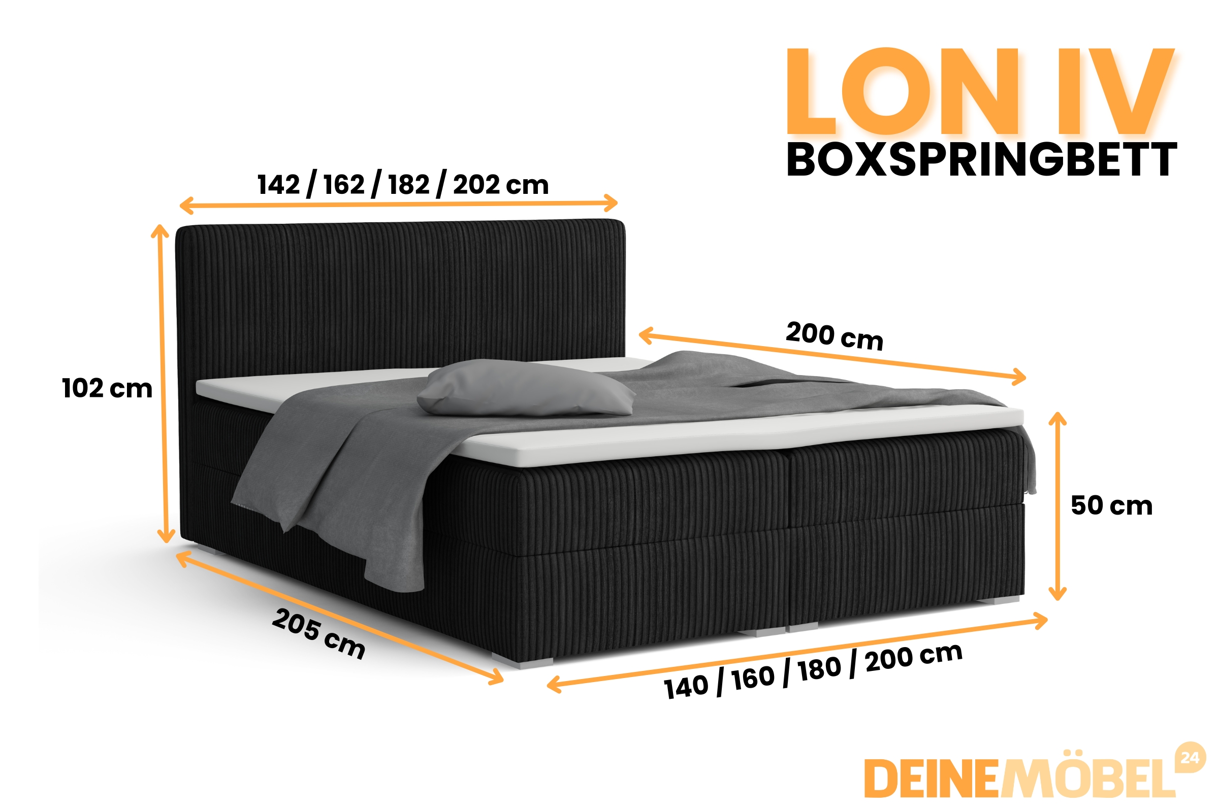 LON IV 180x200 Cord Poso 135 Schwarz Boxspringbett Komplettbett Polsterbett Cord-Samt Deine Möbel