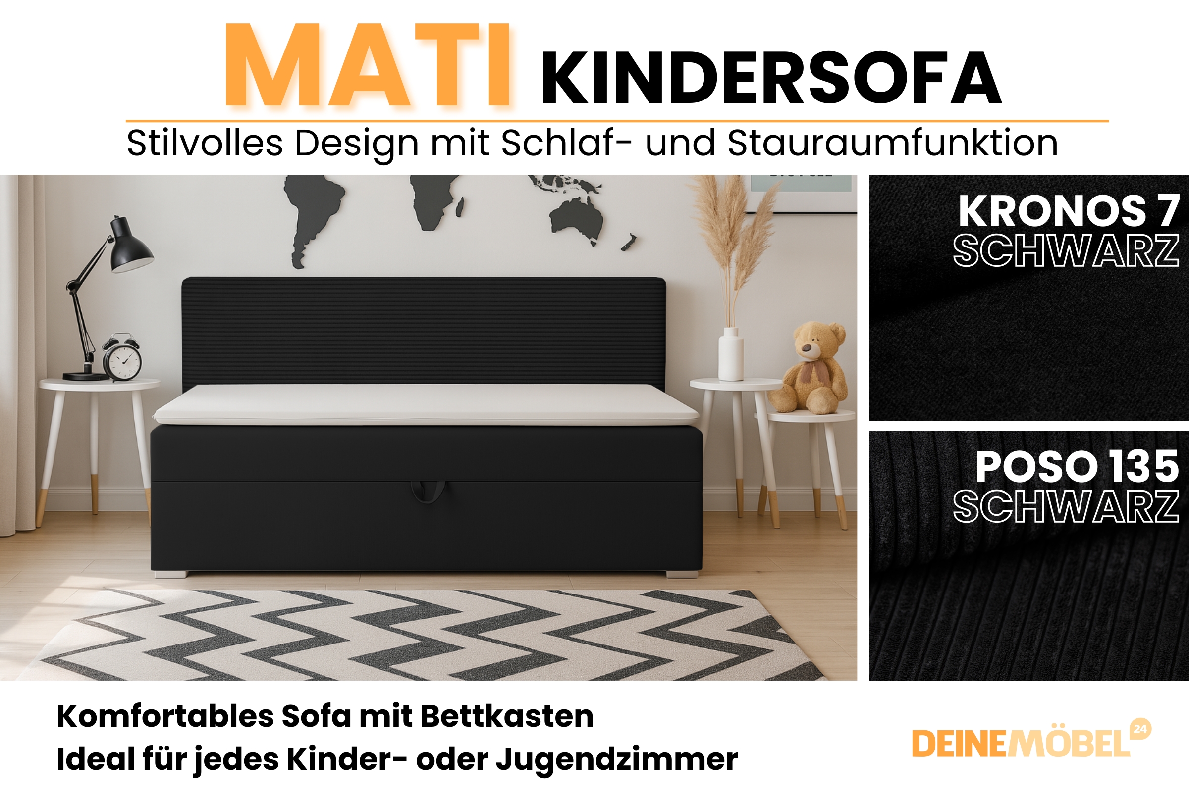 Verwandeln Sie das Kinderzimmer oder Jugendzimmer in eine gemütliche Wohlfühloase mit dem Kindersofa MATI. Dieses moderne Sofa mit Schlaffunktion bietet tagsüber einen bequemen Sitzplatz und wird nachts zum komfortablen Schlafsofa. Der integrierte Bettkasten schafft praktischen Stauraum – ideal für Bettwäsche, Kissen oder Spielsachen. Dank hochwertiger Materialien und stabiler Konstruktion ist das Boxspringbett-Kindersofa die perfekte Verbindung aus Stil, Komfort und Funktionalität.