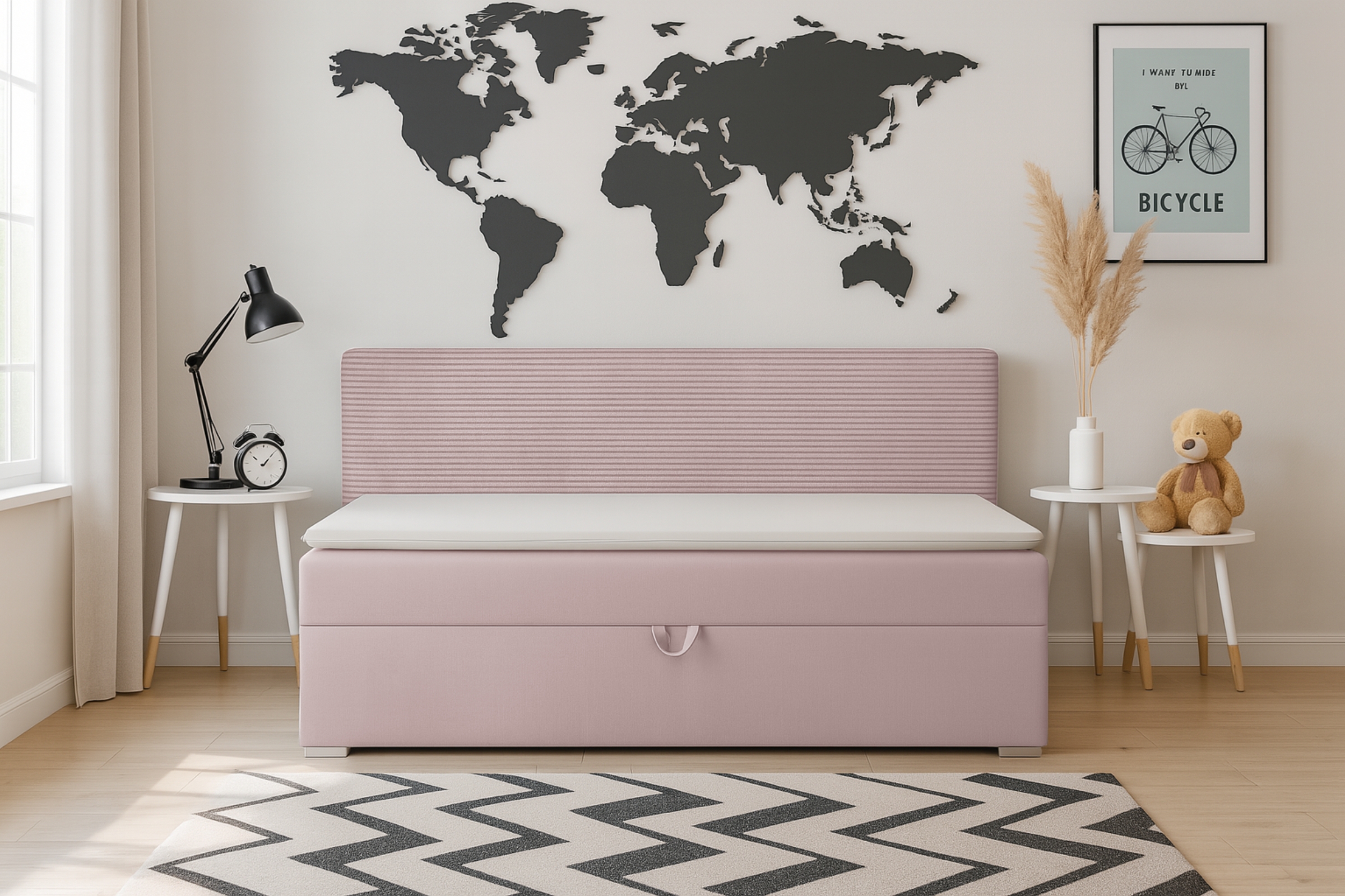 • Seitlich aufklappbarer Bettkasten für zusätzlichen Stauraum