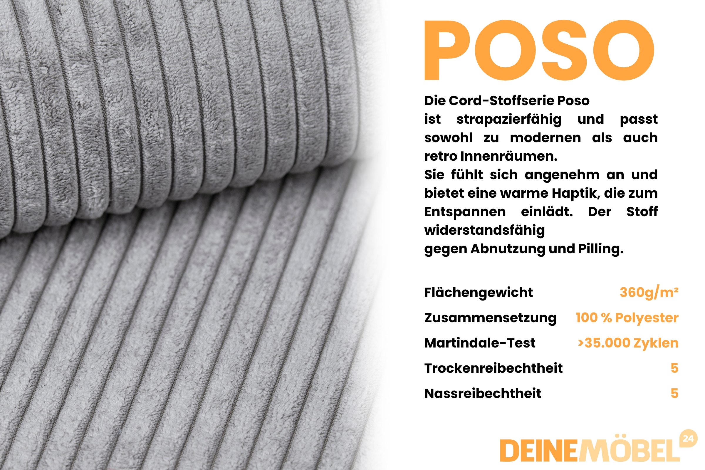 Erhältlich in Ecru, Beige, Hellgrau, Anthrazit und Schwarz. Der Cordstoff sorgt für eine elegante, moderne und pflegeleichte Oberfläche.