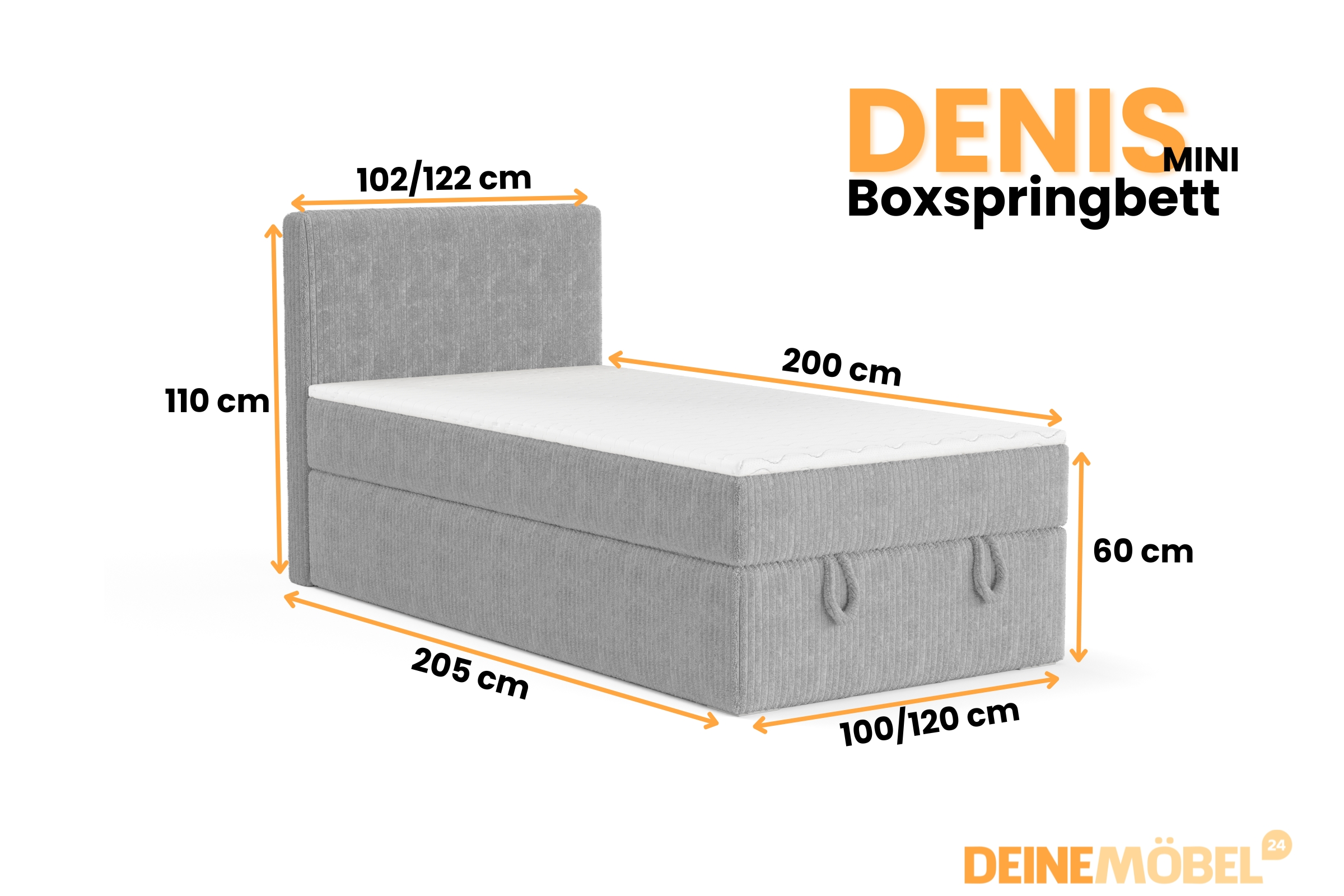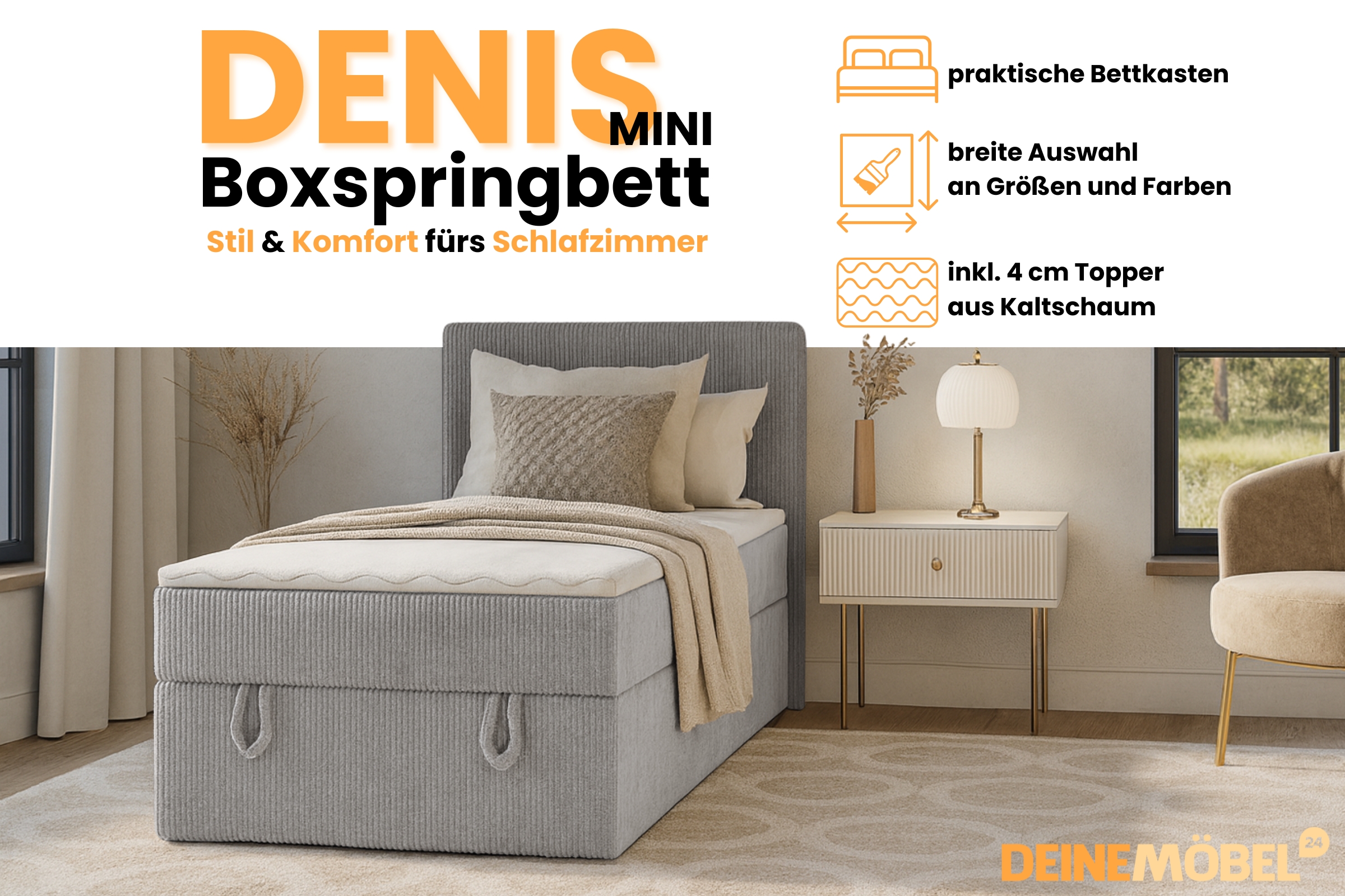 Das Boxspringbett DENIS MINI vereint Komfort, Stil und Funktionalität. Ideal für kleinere Schlafzimmer, bietet es die Vorteile eines Boxspringbettes und praktischen Stauraum. Dieses Bett ist komplett aus Cordstoff gefertigt, was ihm eine einzigartige, moderne Optik verleiht. Das Bett ist wahlweise mit einer Bonellfederkernmatratze H3 oder einer 7-Zonen-Taschenfederkernmatratze H4 erhältlich.