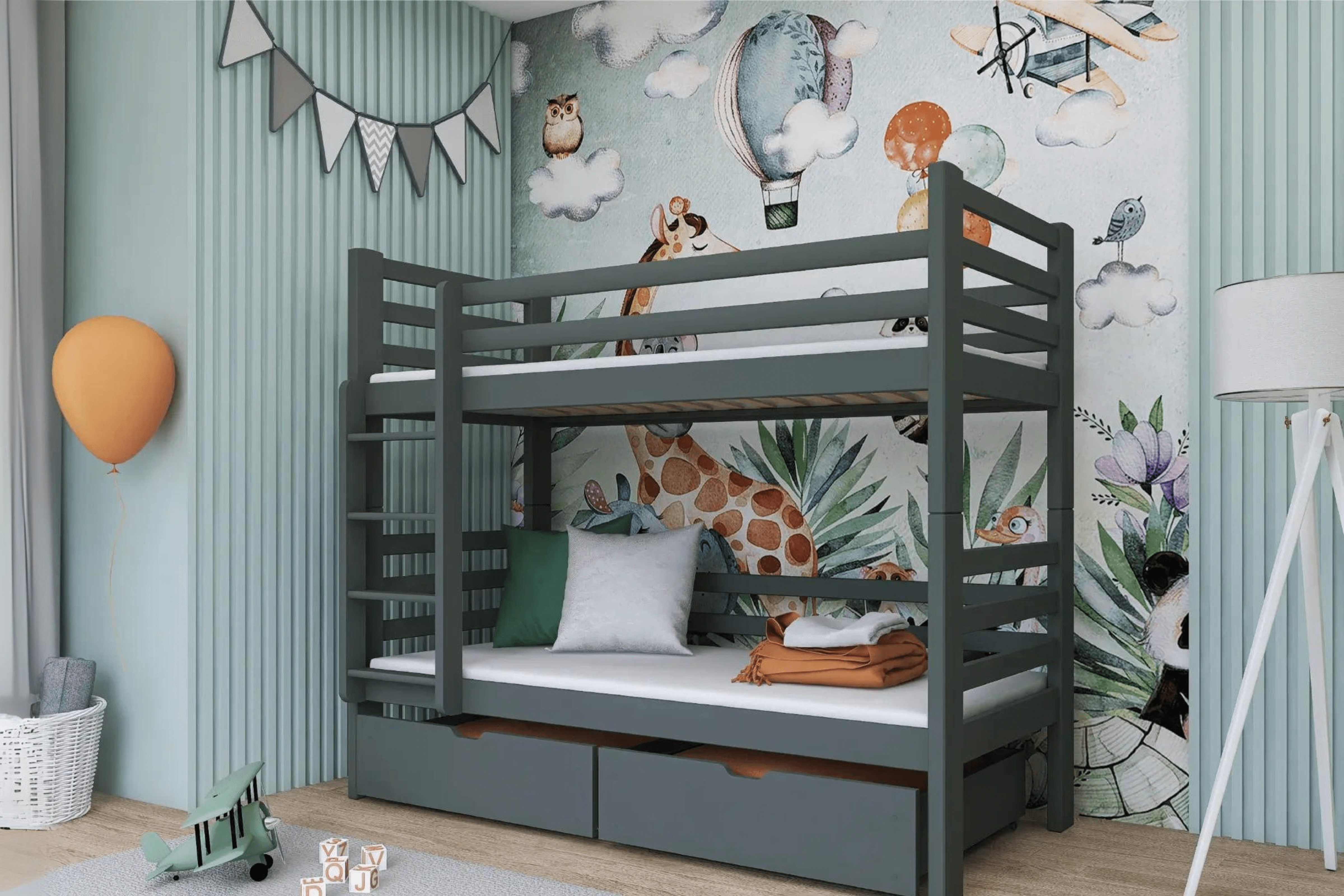 Das Etagenbett PIA 90x200 ist die ideale Lösung für Familien mit zwei Kindern, die eine platzsparende und sichere Schlafmöglichkeit suchen. Hergestellt aus massivem Kiefernholz, bietet das Bett Stabilität und Langlebigkeit. Mit zusätzlichen Schubladen unter dem Bett bietet es auch praktischen Stauraum für Bettwäsche oder Spielzeug. Der abnehmbare Rausfallschutz sorgt für Sicherheit auf beiden Ebenen.