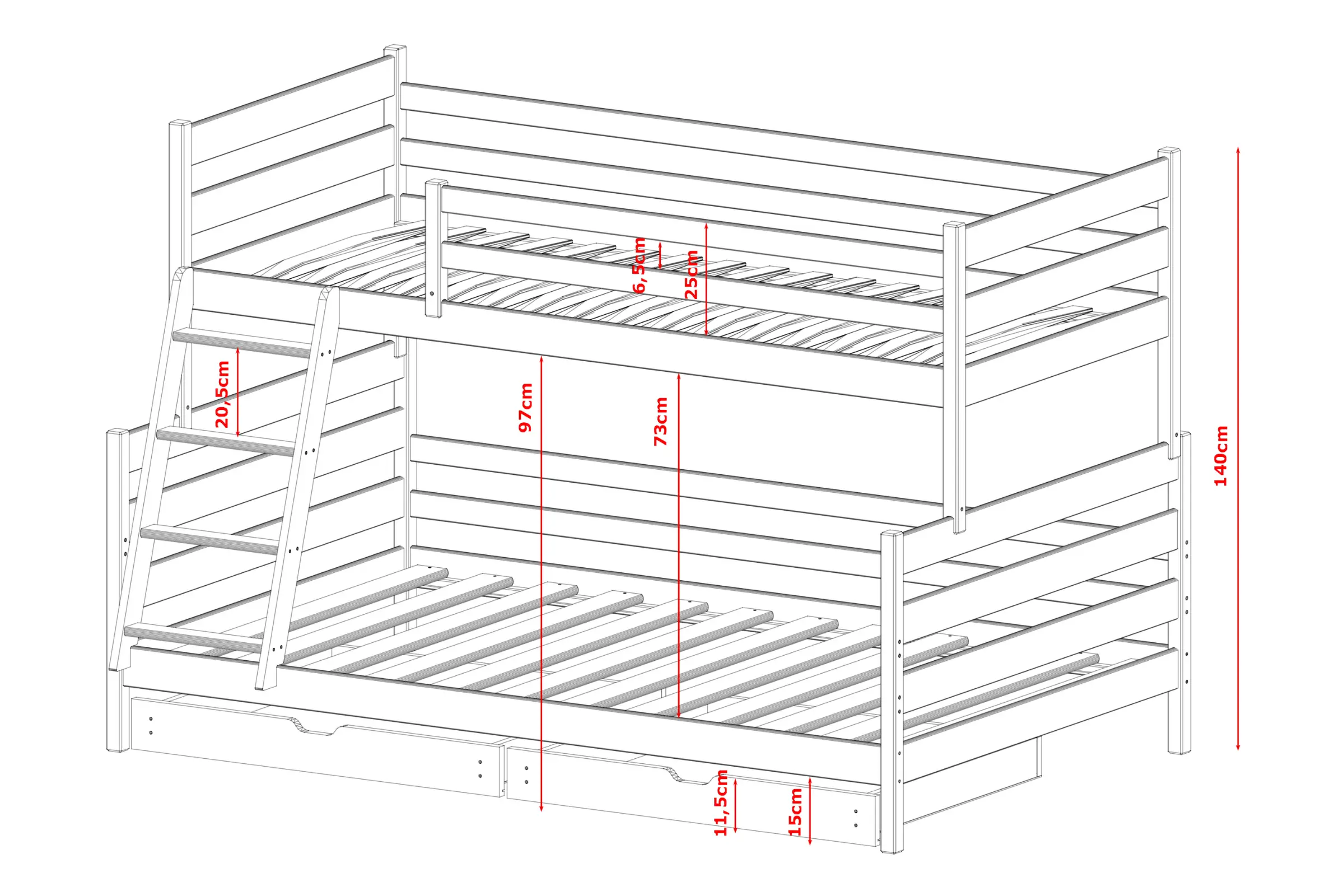 Das Etagenbett FRANZ ist die perfekte Wahl für Familien, die ein stilvolles, funktionales und platzsparendes Bett für zwei Kinder suchen. Mit einer oberen Matratze in der Größe 90x200 cm und einer größeren unteren Matratze 120x200 cm bietet das Bett optimalen Komfort für Kinder jeden Alters, von Vorschulkindern bis hin zu Teenagern. Dank des minimalistischen Designs passt es in jedes Kinder- oder Jugendzimmer und lässt viel Raum für kreative Gestaltung mit Bettwäsche und Dekorationen.