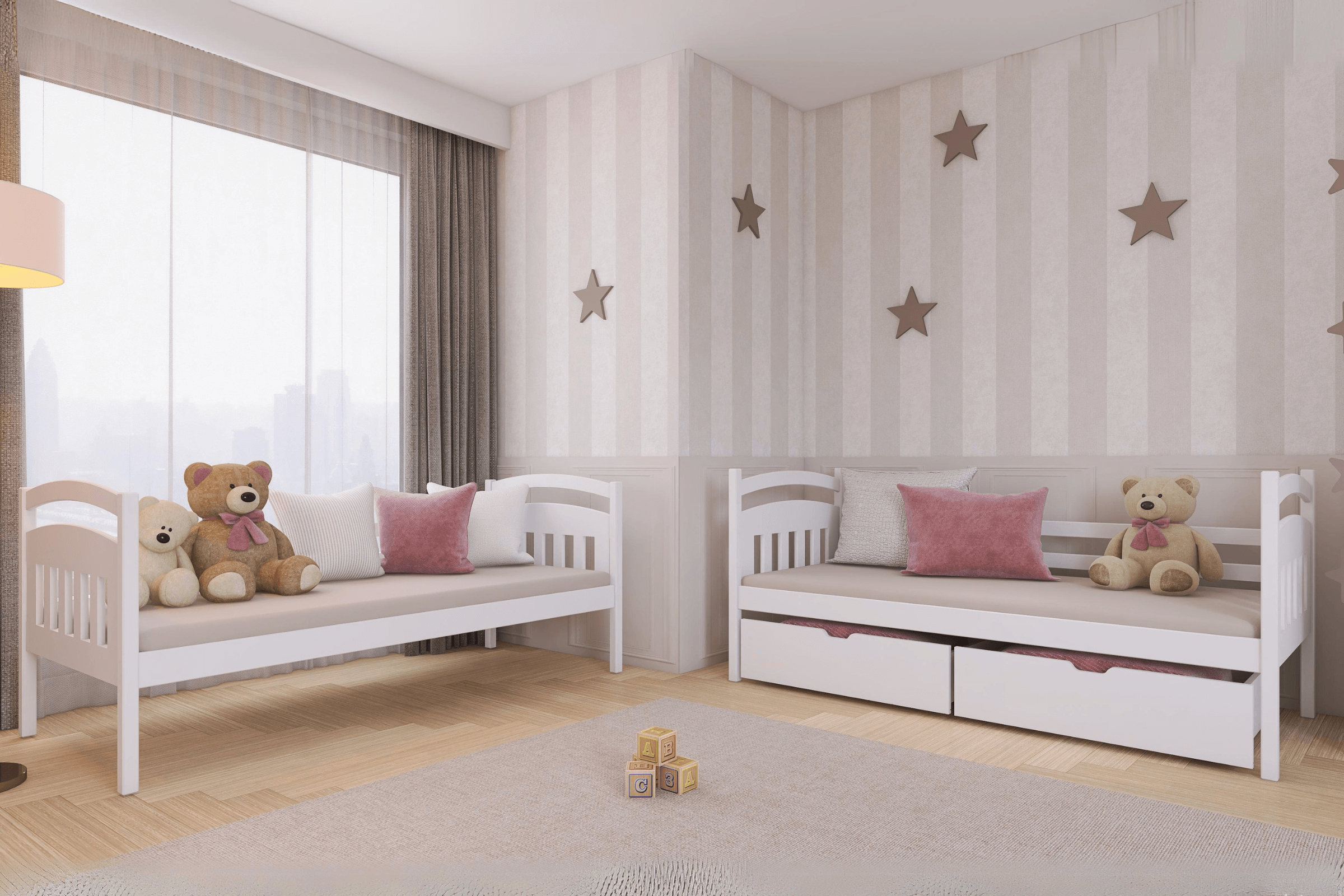 - Praktische Schubladen: Zwei geräumige Schubladen auf Rollen bieten zusätzlichen Stauraum für Bettwäsche oder Spielzeug.
