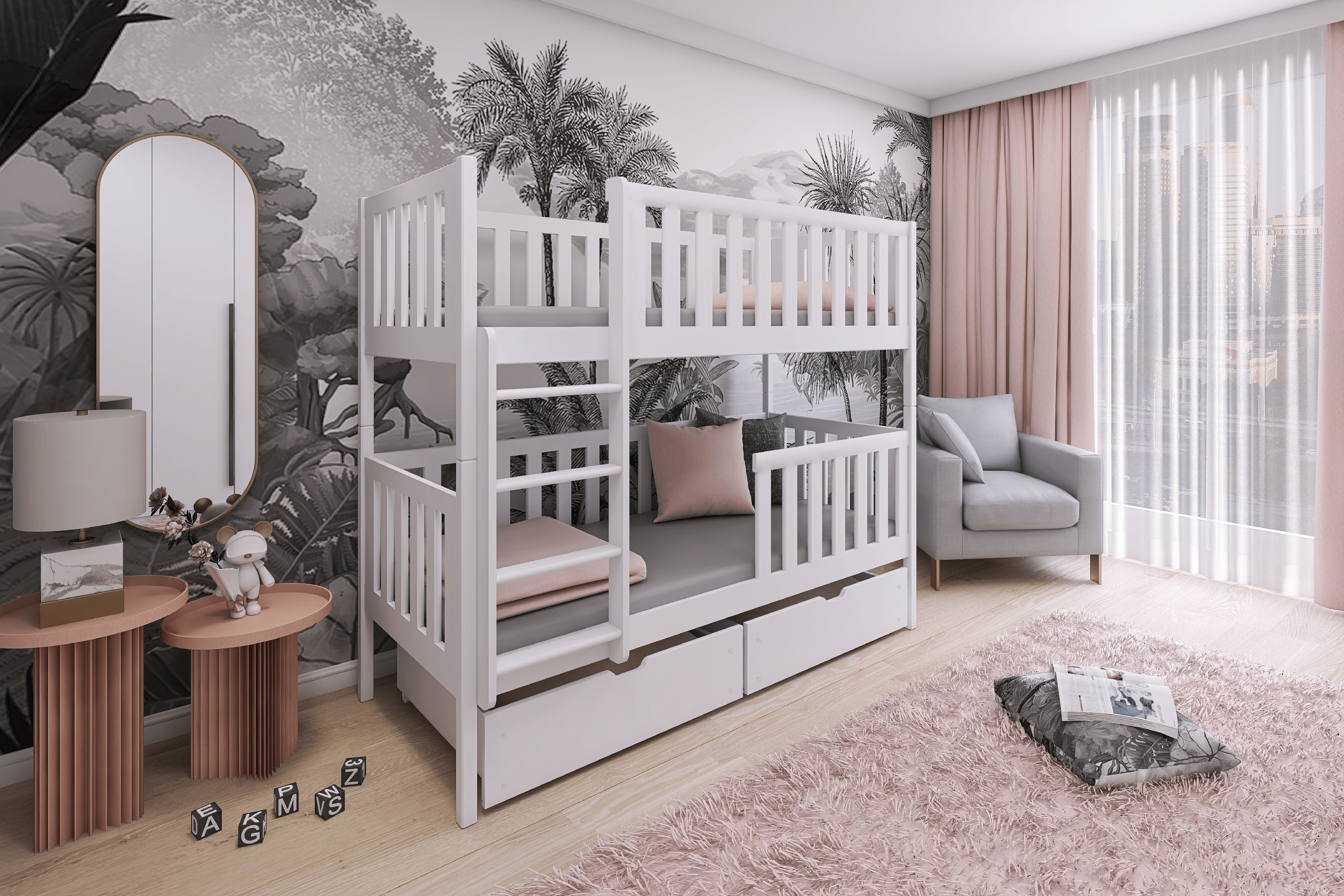 Das Etagenbett MANUEL 90x200 bietet eine sichere, robuste und platzsparende Lösung für Kinderzimmer. Mit seiner stabilen Kiefernholzkonstruktion, dem sicheren Rausfallschutz und den praktischen Schubladen bietet es sowohl Komfort als auch viel Stauraum. Durch die Möglichkeit, das Bett in zwei Einzelbetten zu teilen, ist es flexibel und langlebig.