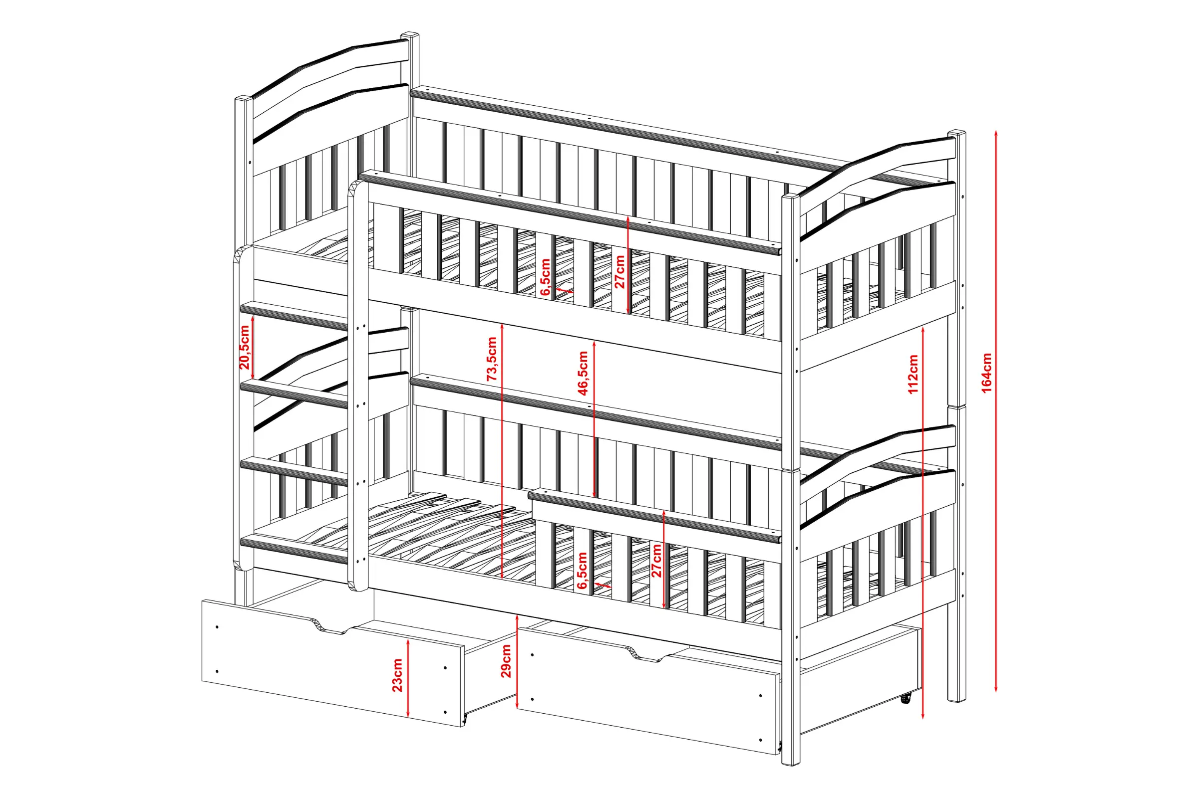 Das Etagenbett RIO 90x200 bietet eine platzsparende und stilvolle Schlaflösung für Kinderzimmer. Die hochwertige Kiefernholzkonstruktion und die zusätzlichen Sicherheitsmerkmale machen es zur perfekten Wahl für Familien mit zwei Kindern. Durch die praktischen Schubladen und die Möglichkeit, das Bett in zwei Einzelbetten zu teilen, bleibt es besonders vielseitig.