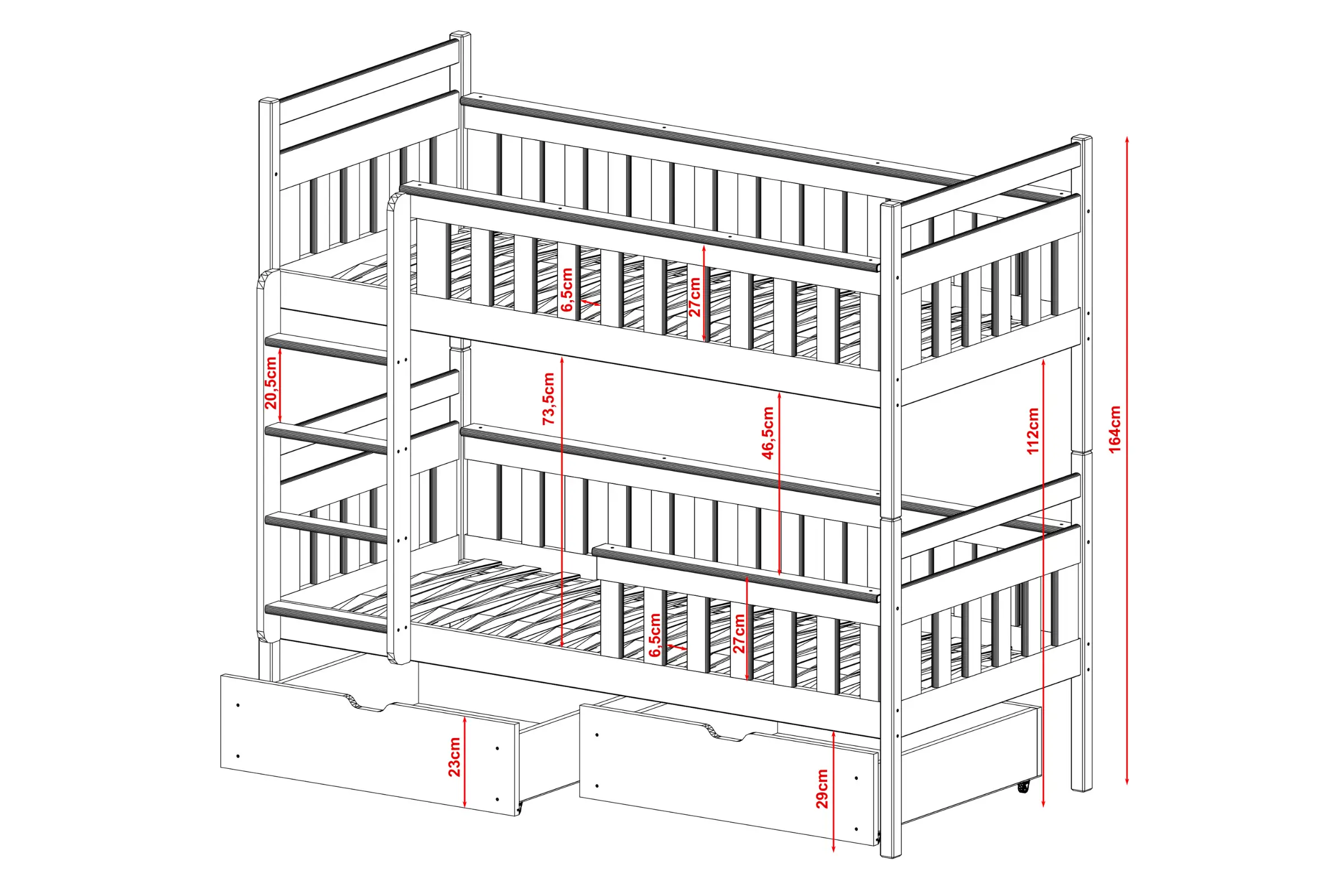 Das Etagenbett TIM 90x200 ist die ideale platzsparende Lösung für Geschwister, die sich ein Zimmer teilen. Es kombiniert Funktionalität mit einem ansprechenden Design und eignet sich perfekt für kleinere Räume, indem es so viel Platz wie ein Einzelbett einnimmt. Die robuste Konstruktion aus massivem Kiefernholz sorgt für Stabilität und Sicherheit, während die integrierten Schubladen zusätzlichen Stauraum bieten.