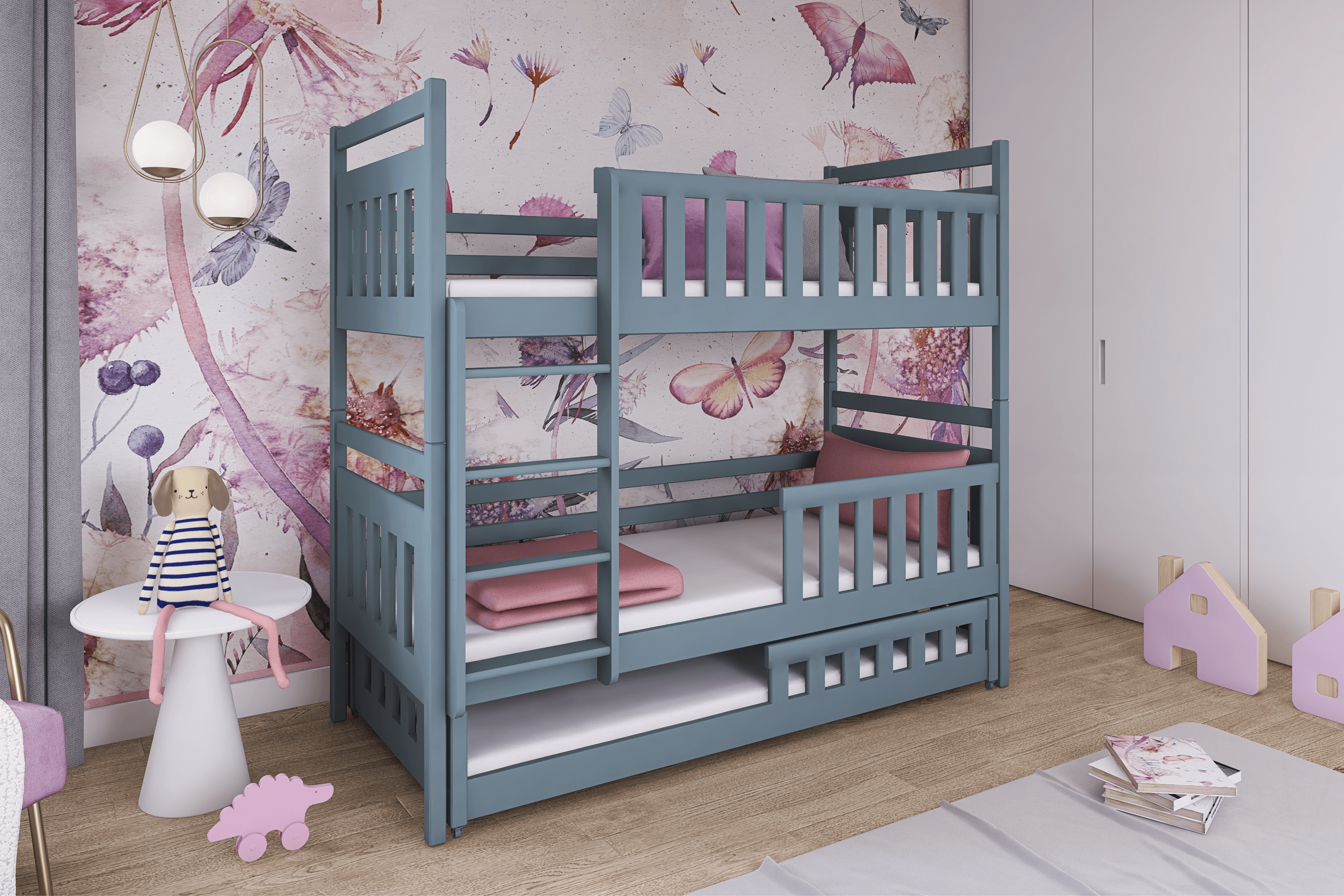 Das Etagenbett EVA ist die ideale Lösung für Familien, die ein platzsparendes, sicheres und praktisches Möbelstück für das Kinder- oder Jugendzimmer suchen. Es wurde so entworfen, dass es Komfort und Funktionalität bietet und gleichzeitig den Bedürfnissen von drei Kindern gerecht wird.