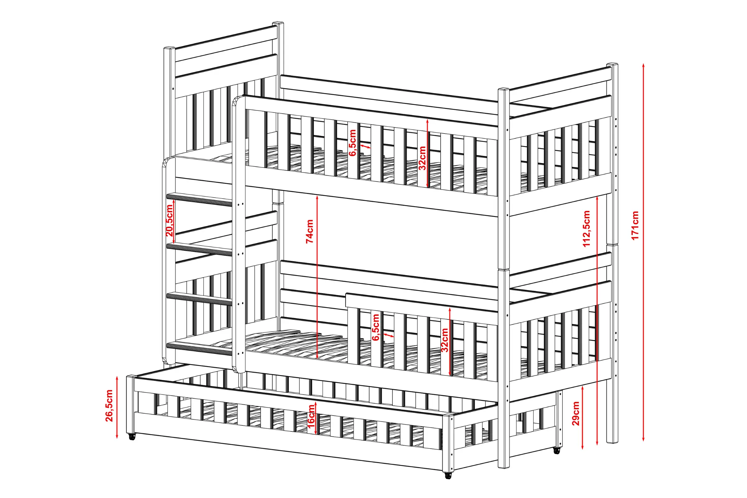 • Matratzengröße: Oberes und unteres Bett – 90x200 cm, ausziehbares Bett – 90x190 cm