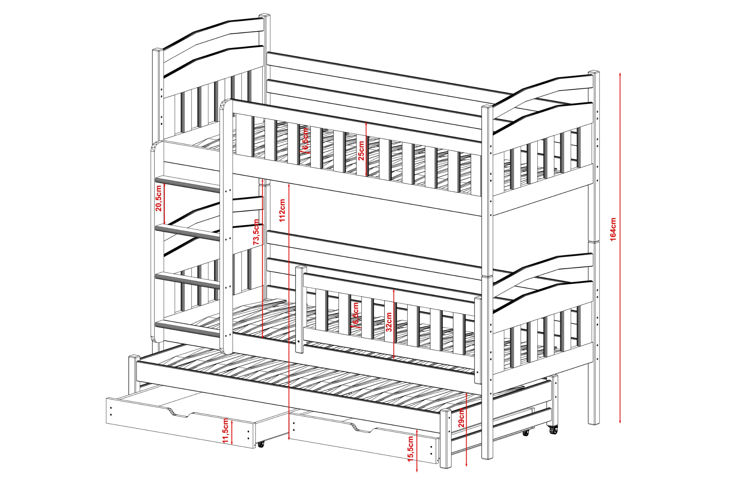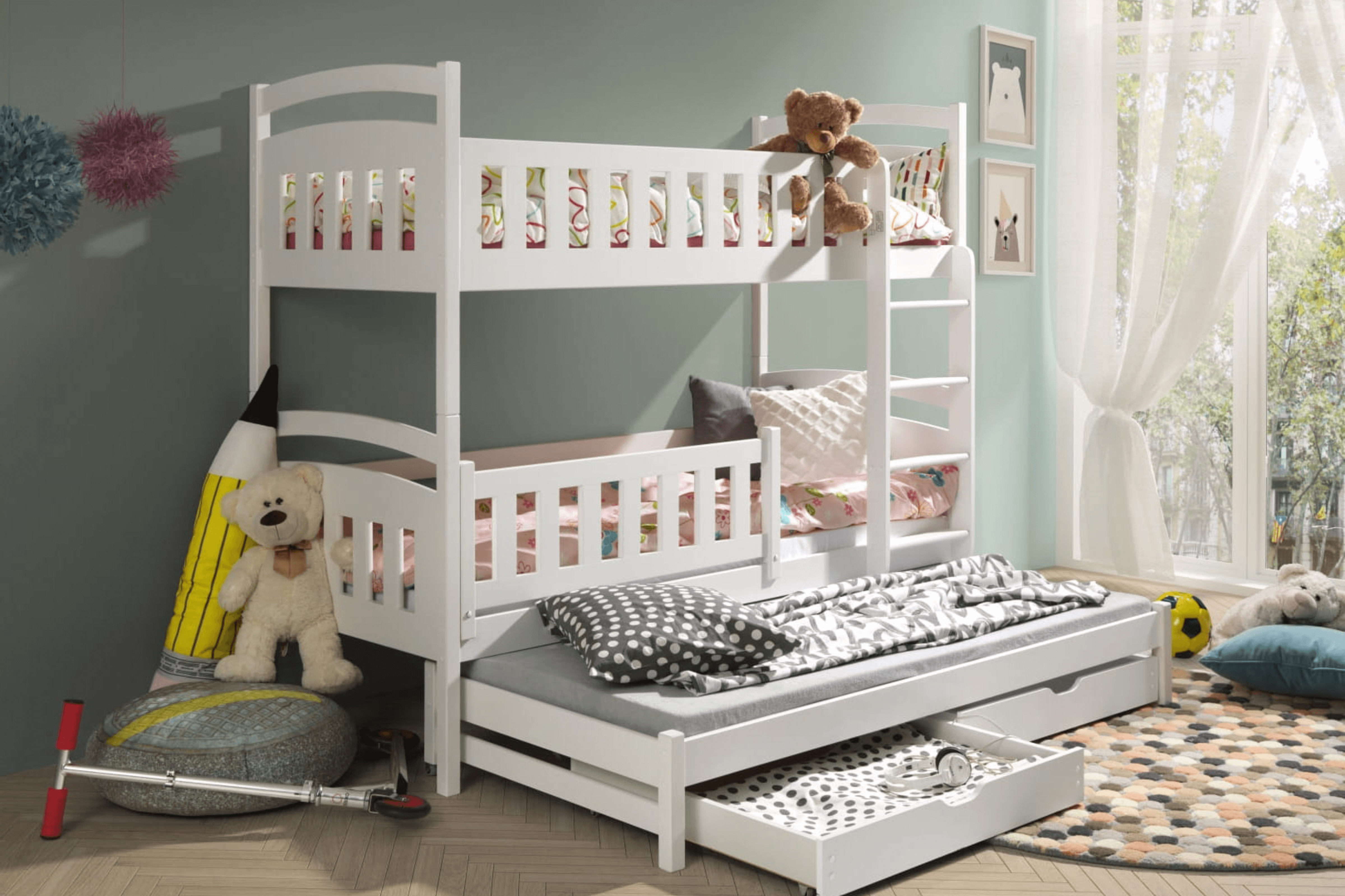 Das Etagenbett IDA 90x200 ist die perfekte Lösung für Familien mit drei Kindern, die auf der Suche nach einem stilvollen und funktionalen Bett sind. Mit einem zusätzlichen ausziehbaren Bett bietet es drei komfortable Schlafplätze, ideal für kleinere Räume. Erhältlich in verschiedenen Farben wie Weiß, Kiefer, Aschgrau und Graphit, passt das Bett perfekt in jedes Kinderzimmer.