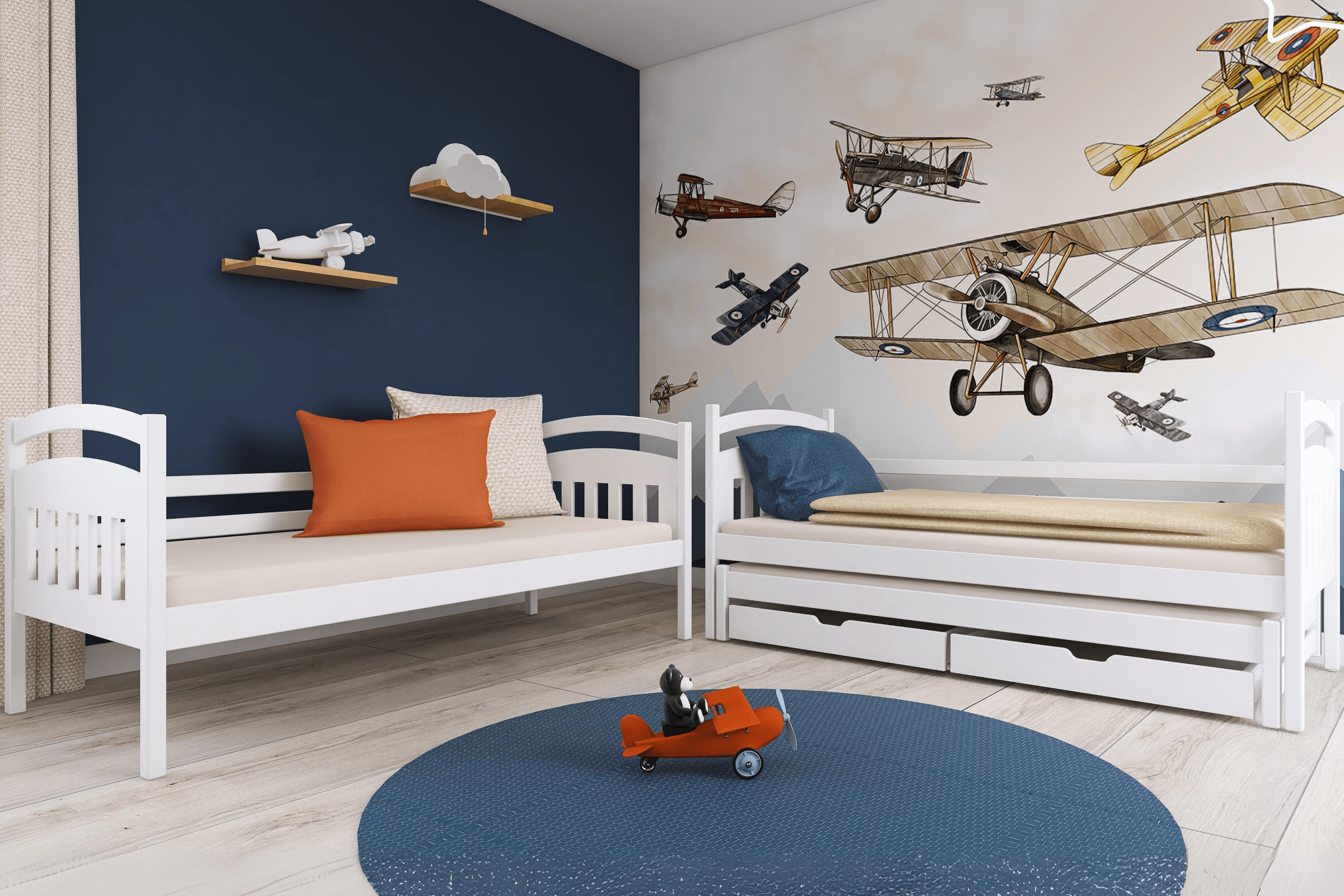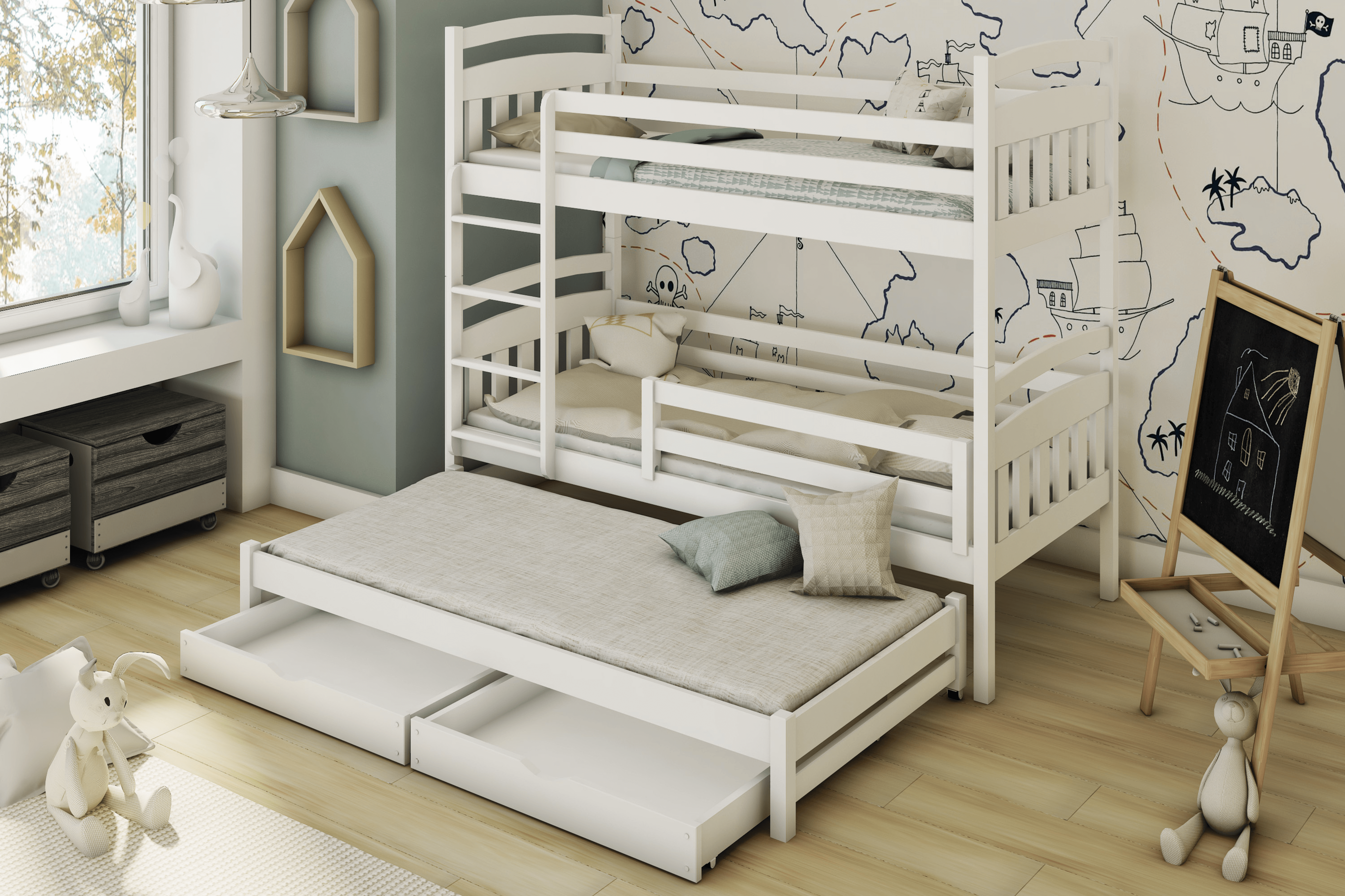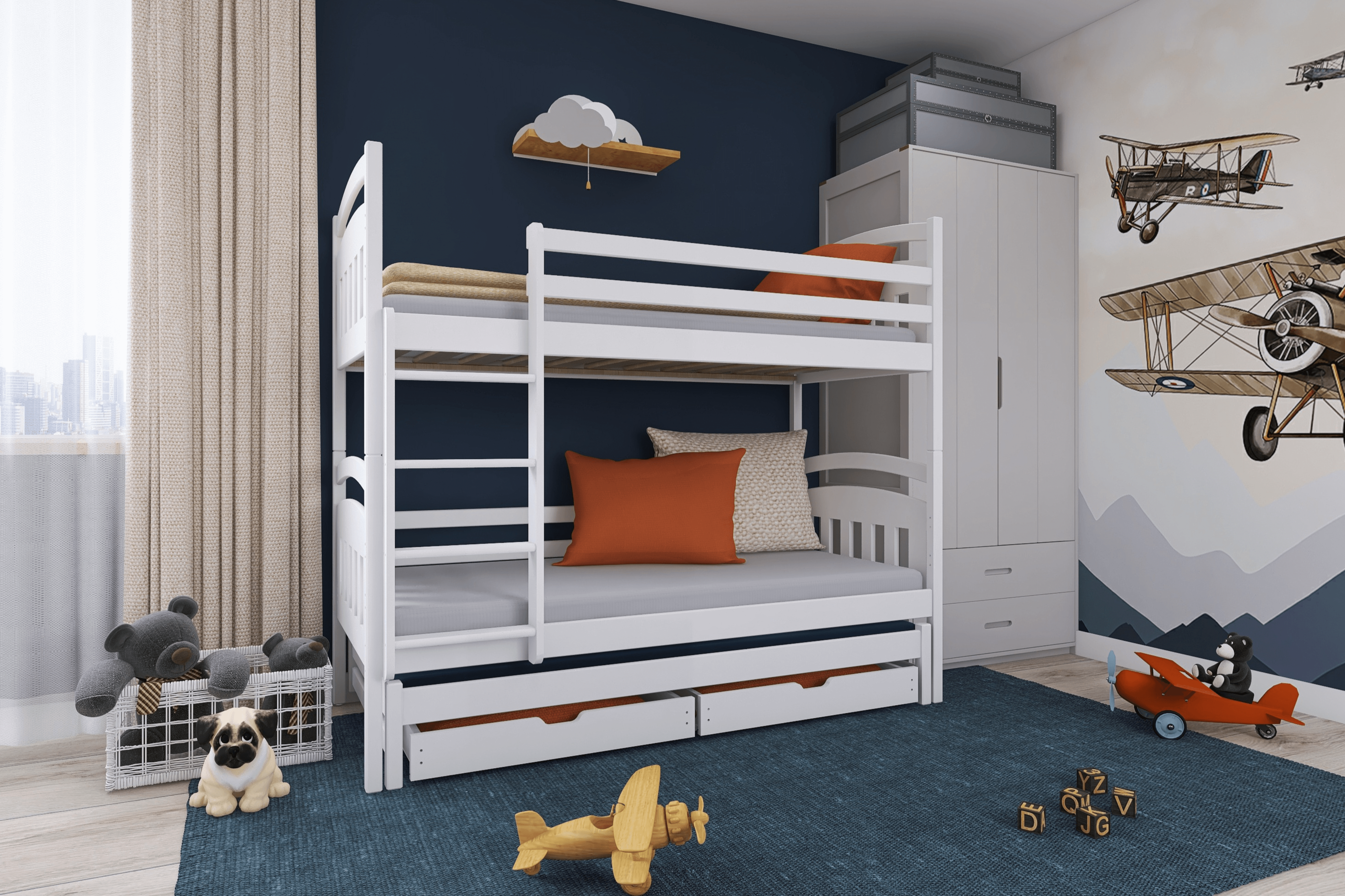 Das dreifache Hochbett ALAN ist die ideale Lösung für kleine Räume und bietet Platz für bis zu drei Kinder. Es passt sich individuell an, mit Optionen für zusätzliche Schubladen und höherem Abstand zwischen den Betten für mehr Komfort. Das dritte Bett kann auch als Gästebett oder Spielbereich genutzt werden. ALAN kombiniert Funktionalität und Sicherheit und ist perfekt für jedes Kinderzimmer.
