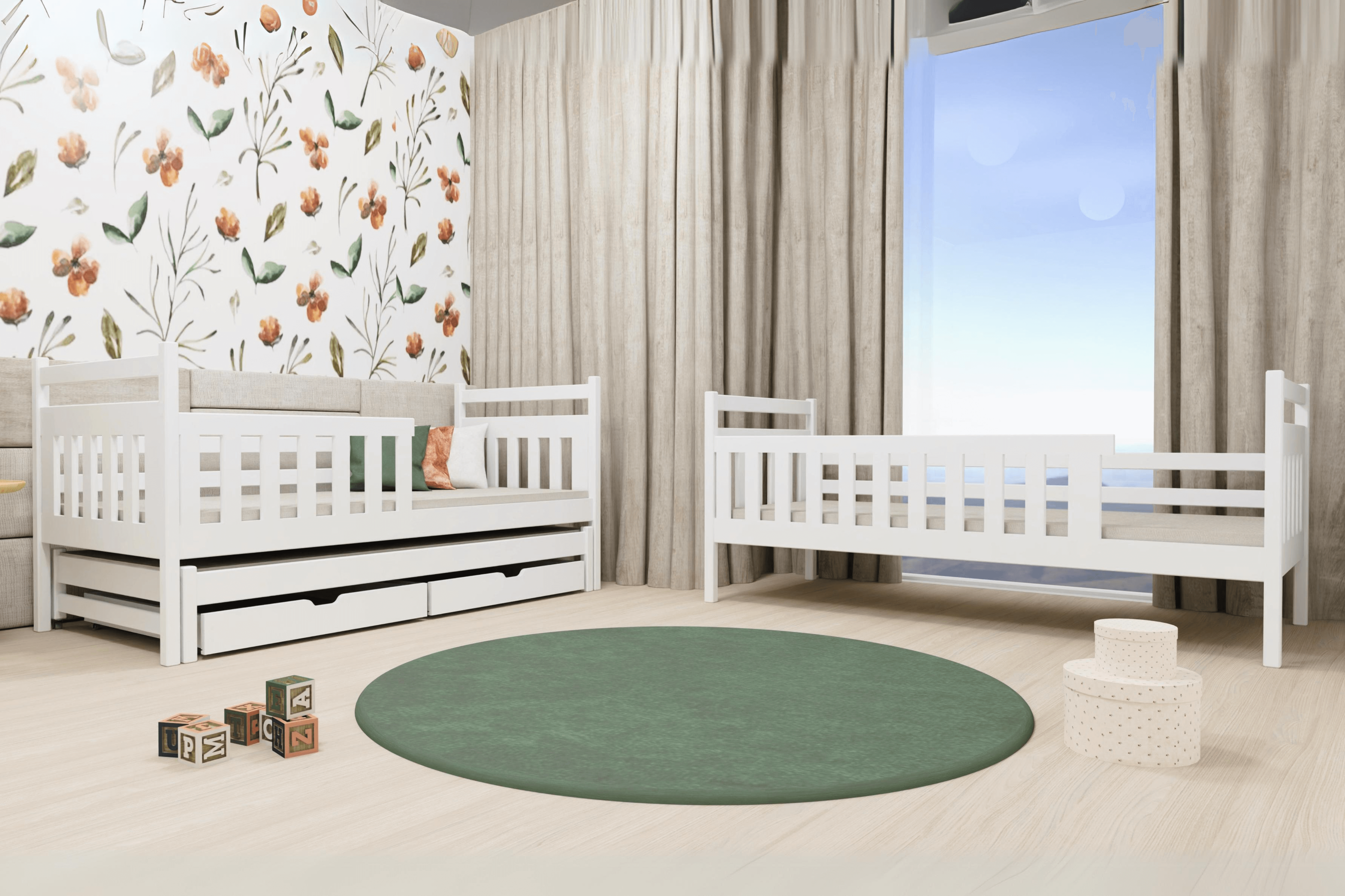 • Praktische Schubladen: Zwei geräumige Schubladen auf Rollen bieten Stauraum für Bettwäsche oder Spielzeug.
