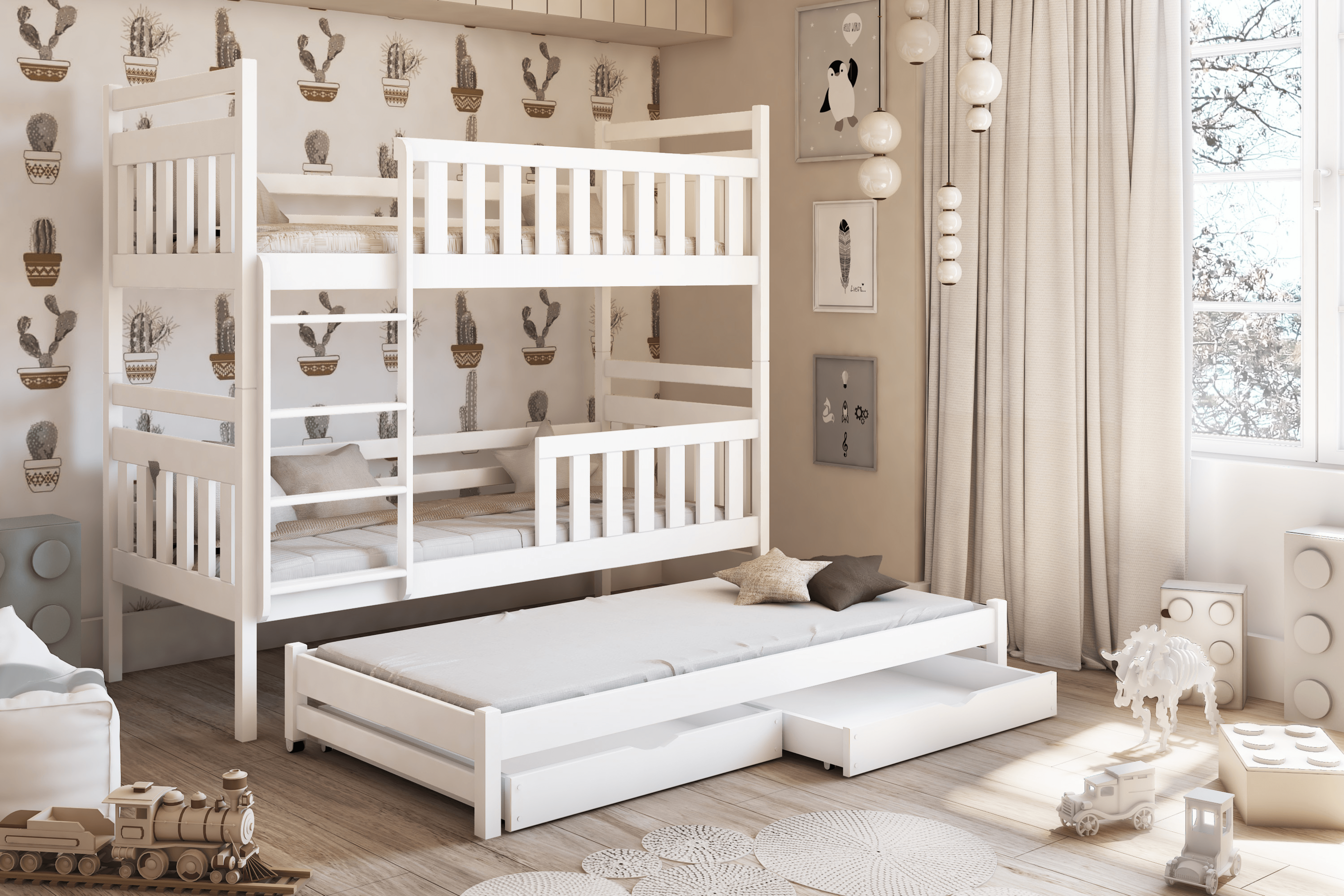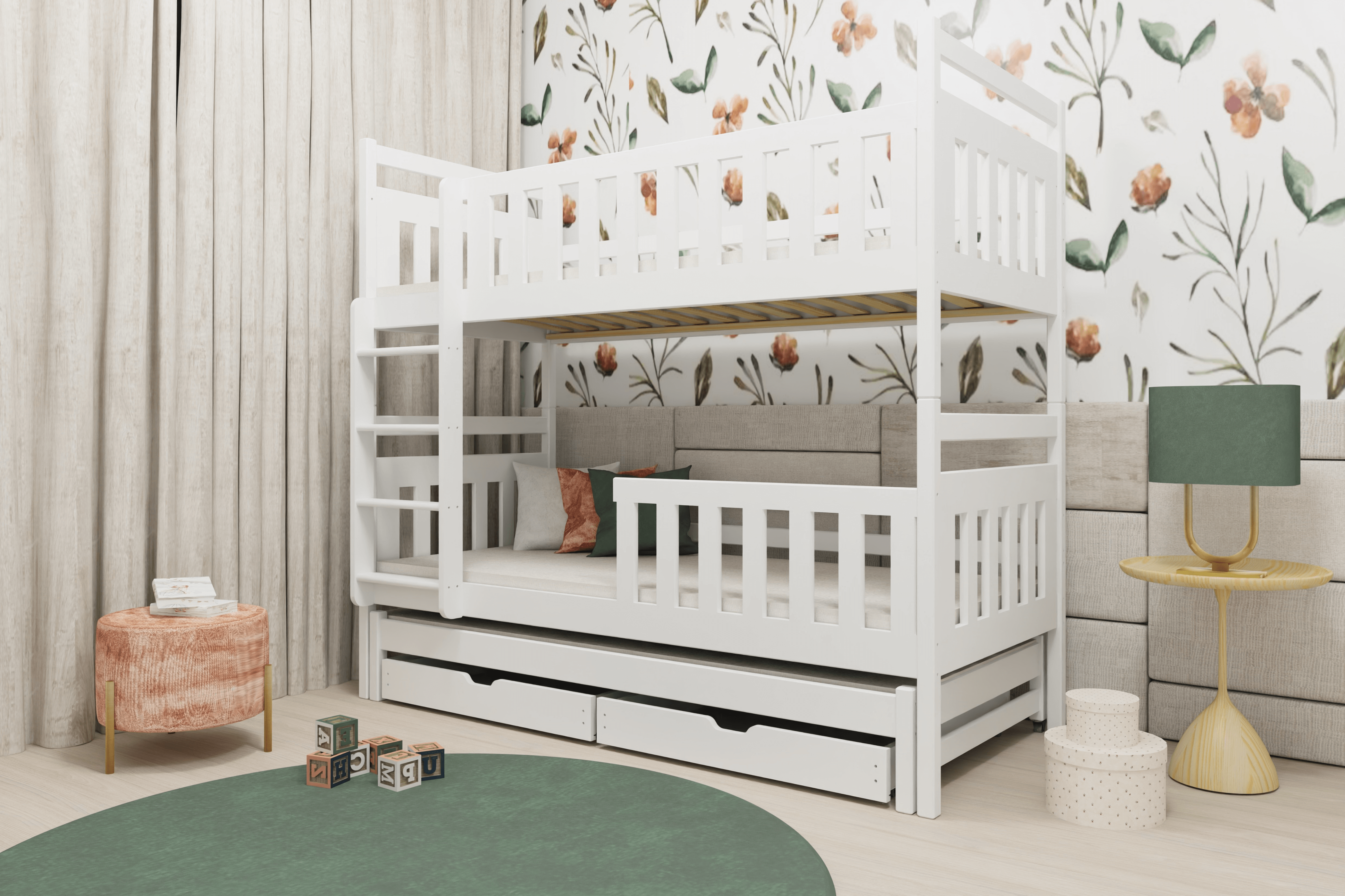 Das Etagenbett KAJA 90x200 ist die ideale Lösung für Familien mit drei Kindern, die auf der Suche nach einem platzsparenden und funktionalen Bett sind. Das Bett bietet Platz für drei Personen und passt perfekt in kleinere Räume, da es den Platz eines Einzelbettes einnimmt. Hergestellt aus massivem Kiefernholz, bietet es Stabilität und Sicherheit, ideal für Geschwister.